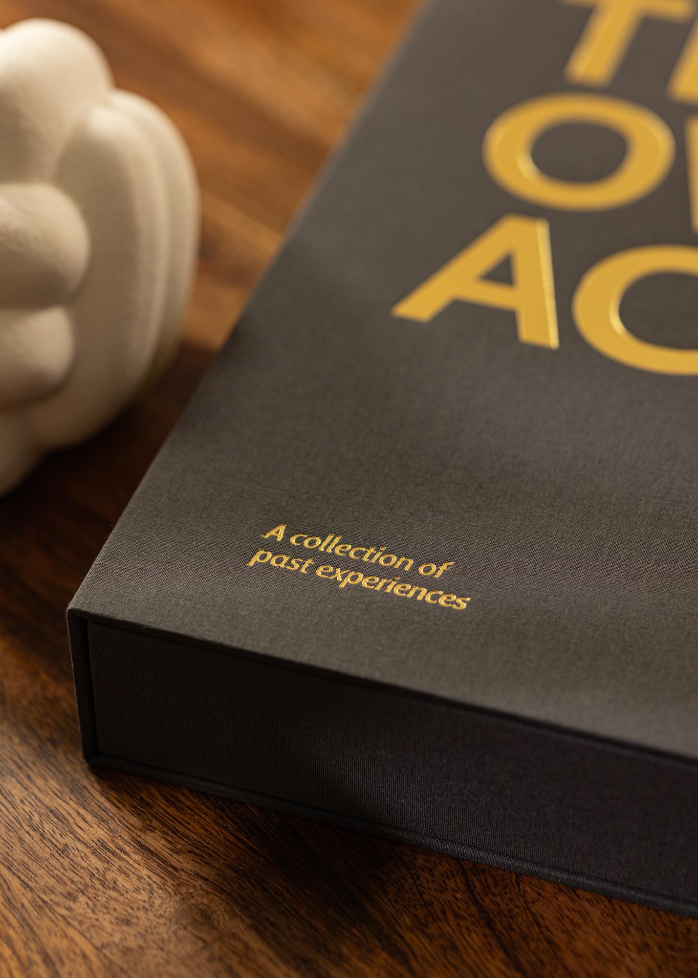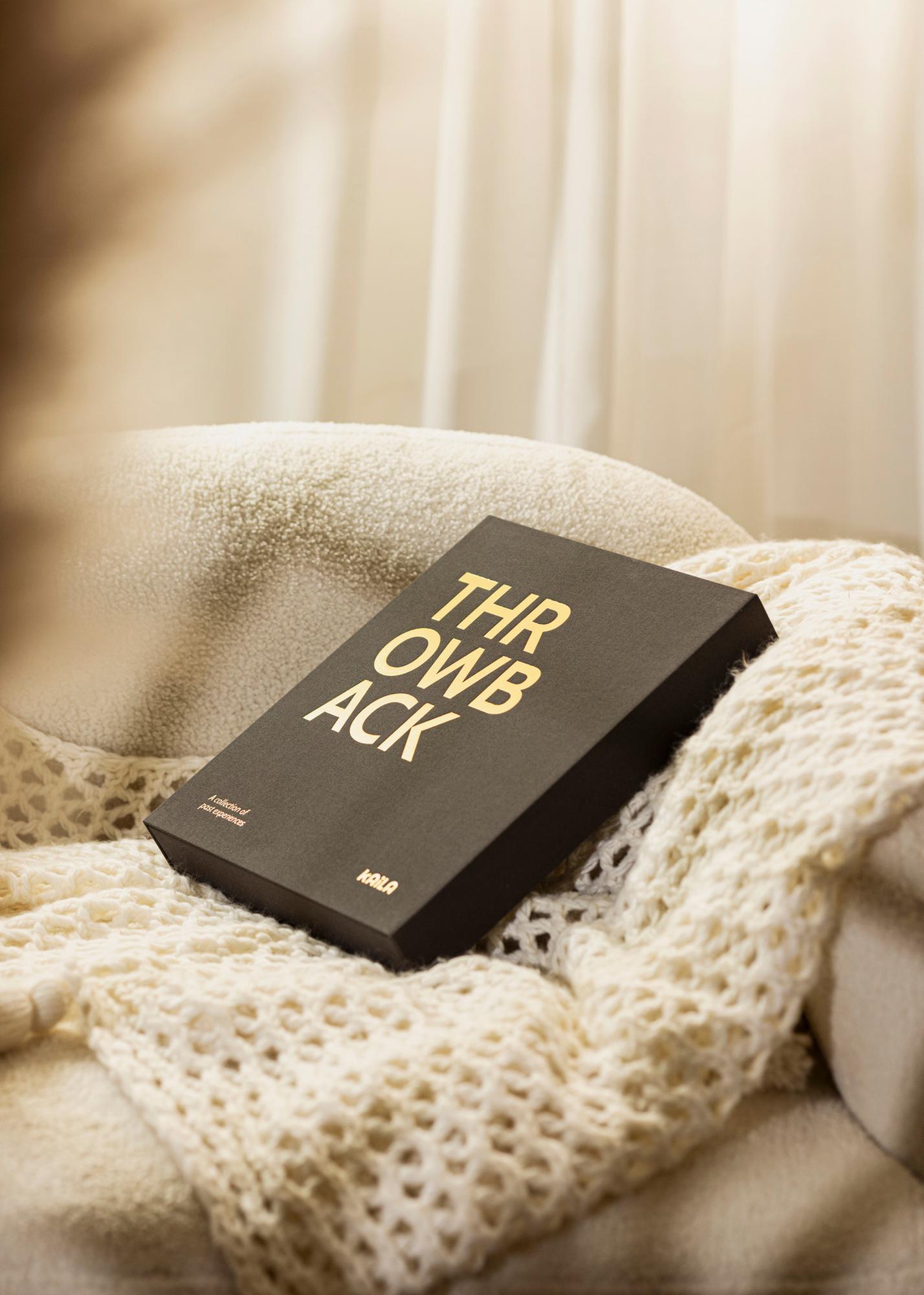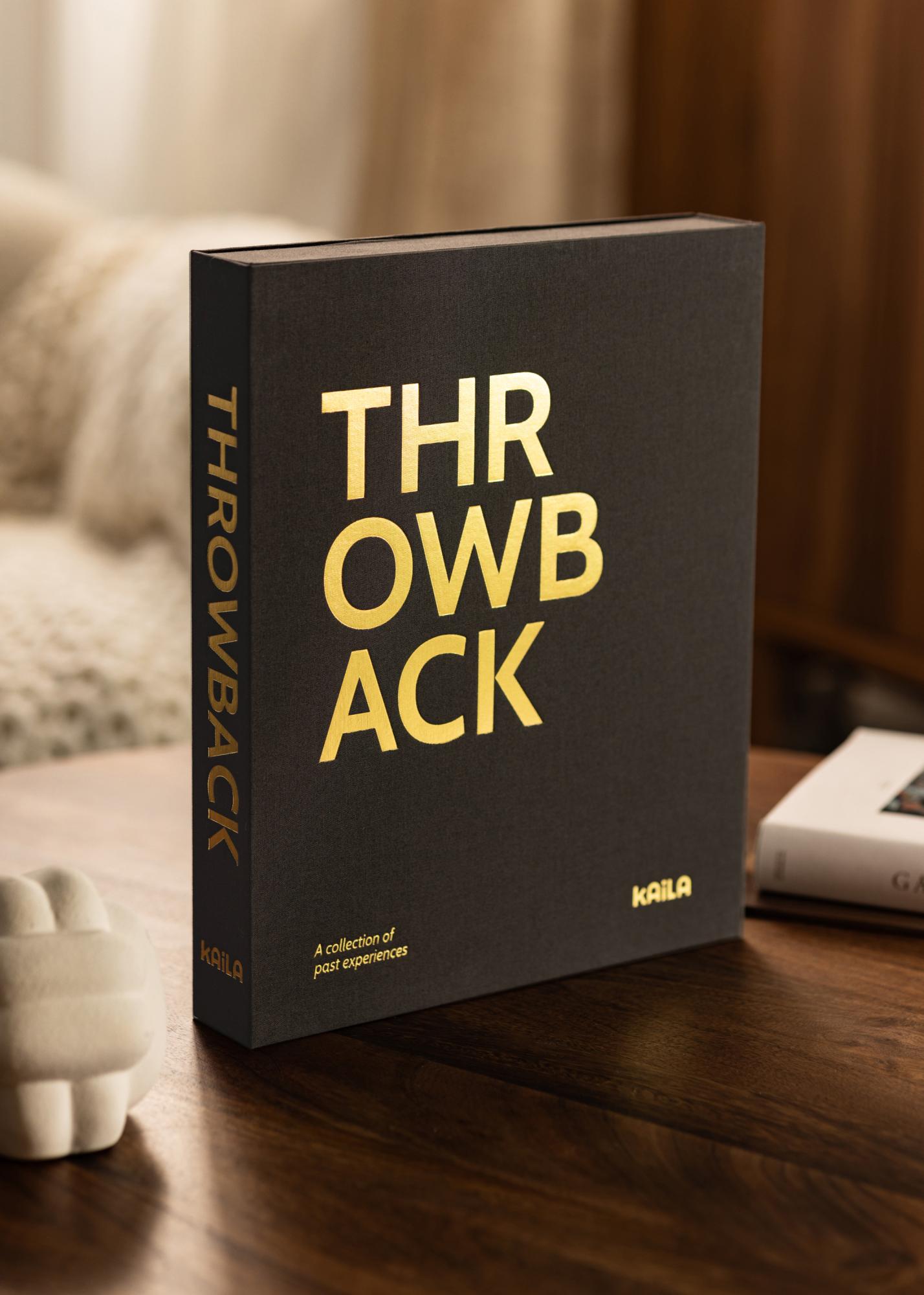 Tolles, trendy Fotoalbum, das luxuriös designt ist wie ein Coffee Table Book, deshalb auch der Name Coffee Table Photo Album. Das Fotoalbum besitzt die Form einer exklusiven, dekorativen Schachtel, die geöffnet werden muss, um an den Inhalt zu kommen. Der elegante Einband aus schwarzem Textil mit dem goldenen Aufdruck ”THROWBACK” auf Vorder- und Rückseite ziert dieses außergewöhnlich stilvolle Fotoalbum. Dieses bekannte Wort für "Rückblick, Rückkehr" verleiht dem Fotoalbum einen modernen und vielleicht auch einen etwas überzogenen, zu pathetischen Ausdruck, der sich allerdings wirklich von gewöhnlichen, klassischen Fotoalben unterscheidet. Das Album besitzt auch einen Untertitel mit dem Text ”A collection of past experiences”, der sich auf der linken Seite unten in der Ecke befindet.