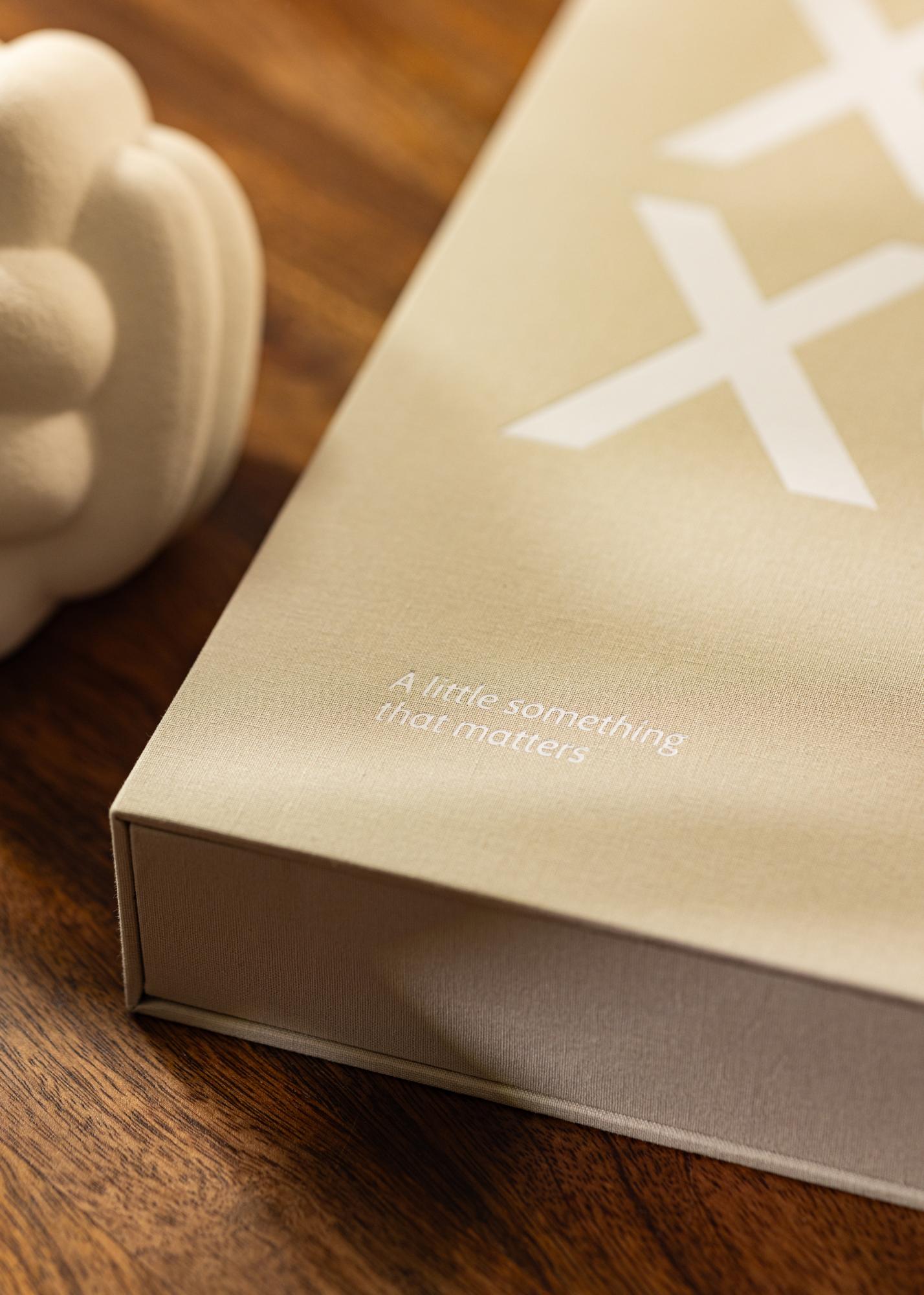 Hübsches, stilsicheres Fotoalbum, designt wie ein trendy Coffee Table Book, weshalb es auch Coffee Table Photo Album genannt wird. Das Fotoalbum zeichnet sich durch den elegante Textil-Einband in Grau und den weißen Aufdruck auf Vorder- und Rückseite mit dem wohlbekannten Abschiedsgruß ”XOXO”, der für Küsschen und Umarmungen steht, aus. Dieser trendige Titel wird durch den Untertitel mit den Worten ”A little something that matters” komplettiert, der sich ganz unten links in der Ecke befindet. Ein wirklich stilvolles Fotoalbum mit einem etwas anderen, verspielteren Design, das sich ganz bestimmt von der Masse abhebt.