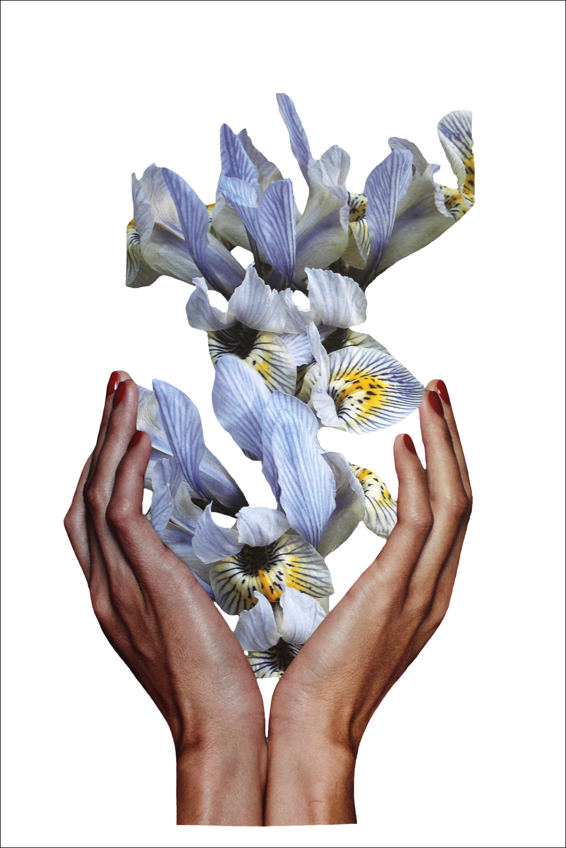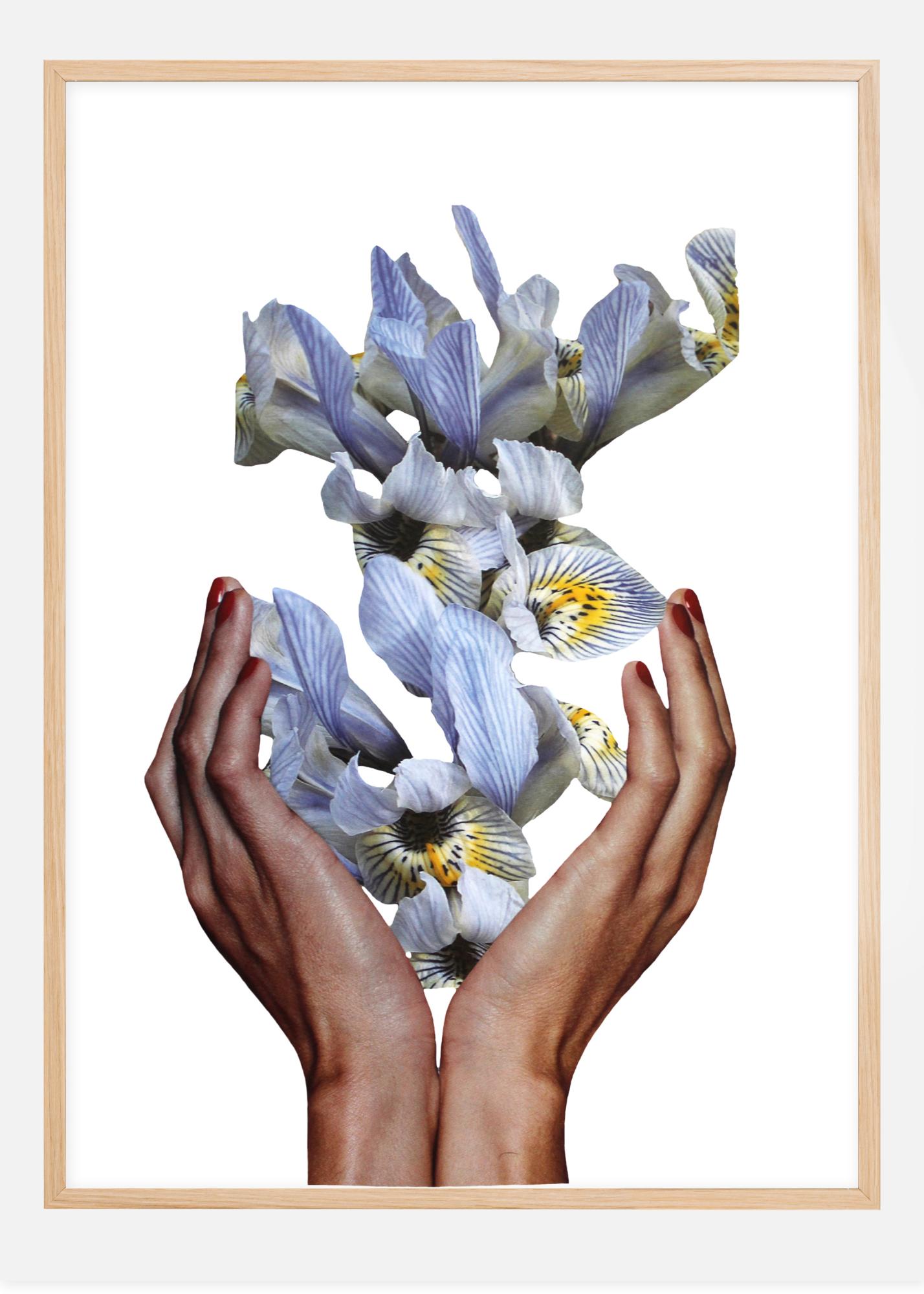 Ein wunderschönes Blumenbild mit blasslila Schwertlilien. Zarte offene Hände mit schön lackierten Nägeln halten die Schwertlilien sanft. Der weiße Hintergrund hebt die zarten Mauve- und Gelbtöne hervor und schafft so ein zartes, aber schönes Blumenbild. Ein entspannender Druck zur Belebung einer schlichten weißen Wand.