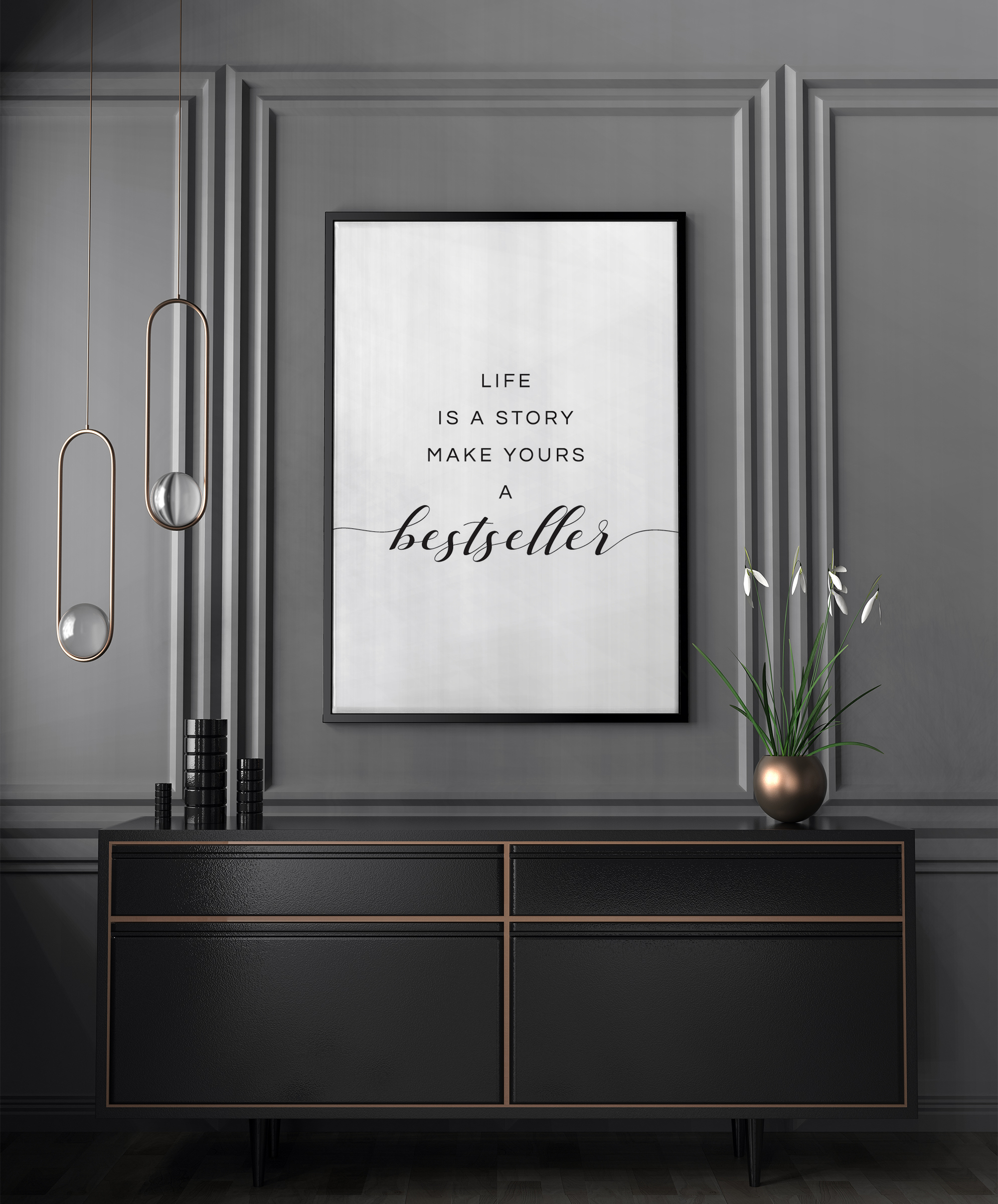 Ein schwarz-weißer Motivationsdruck, der eine einfache, aber wirkungsvolle Botschaft vermittelt. Die in Pyramidenform geschriebenen Wörter ermutigen den Leser, seine Lebensgeschichte zu einem Bestseller zu machen. Das Wort "Bestseller" ist in einer eleganten schwarzen Schrift geschrieben, während die anderen Wörter in einfachen schwarzen Großbuchstaben geschrieben sind. Mach dein Leben zu einem Bestseller.
