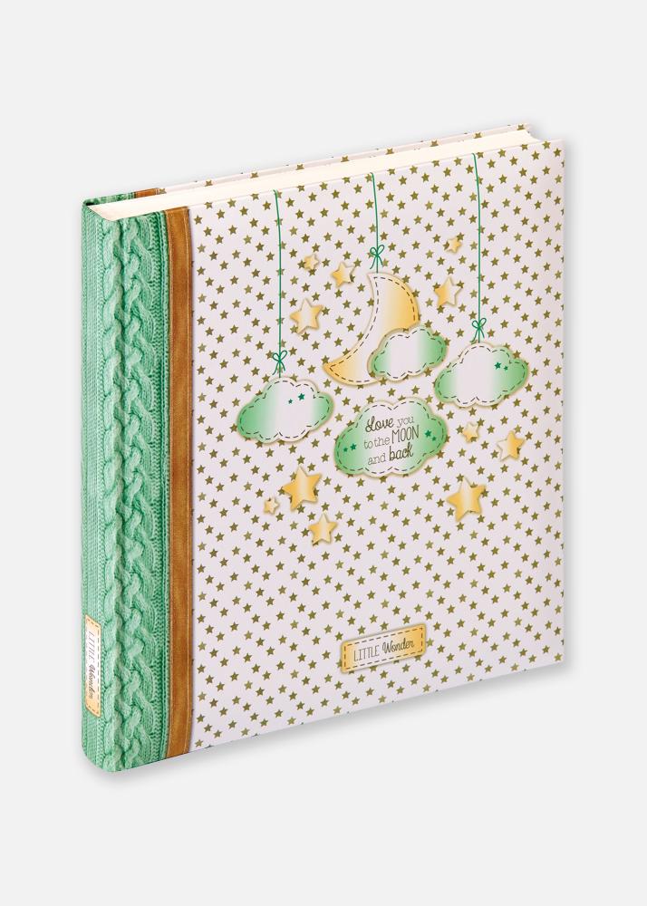 Dieses Fotoalbum besitzt eine weiße Vorderseite mit Strickzopf-Muster am Rand und über den Albumrücken sowie eine himmlische Illustration mit Sternen in verschiedenen Größen, Wolken und einem Mond. Der Text ”Love you to the moon and back”, der in einer der Wolken steht, verbindet die Motive des illustrierten Kunstdruckeinbandes zu einem Ganzen. Die ersten Albumseiten sind mit Illustrationen im gleichen Stil verziert und bieten genügend Raum für eigenen Text.