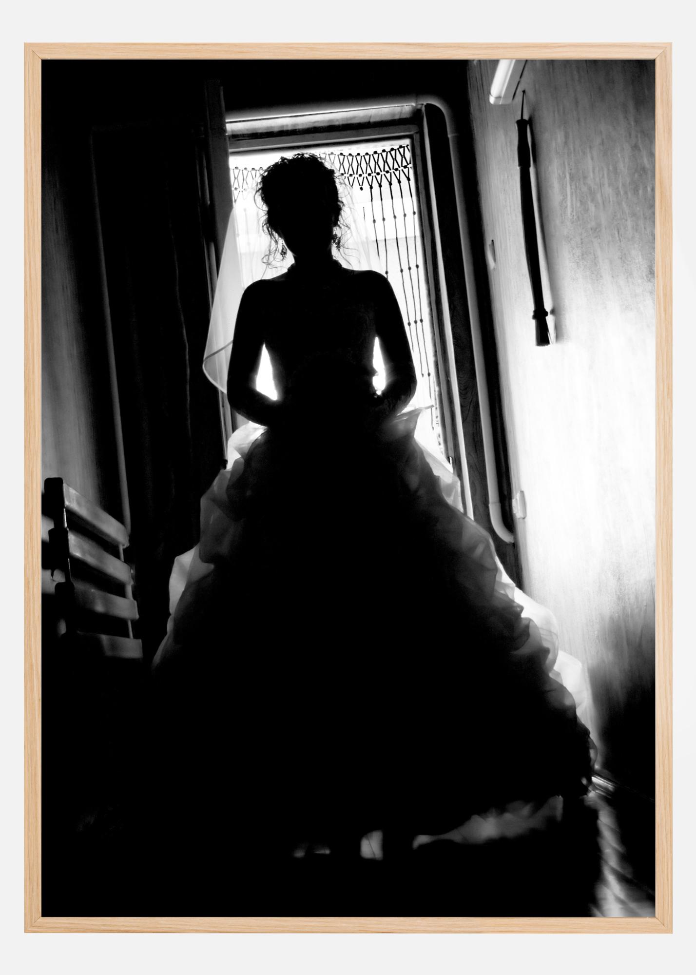 Fotografische Kunst in dunklem Graustufen von einer Braut, die im Gegenlicht fotografiert wurde. Ein dunkles und diffuses Poster, das Interesse und Neugier weckt. Kombinieren Sie es gerne mit anderen Favoriten für eine größere, lebendigere Bilderwand.