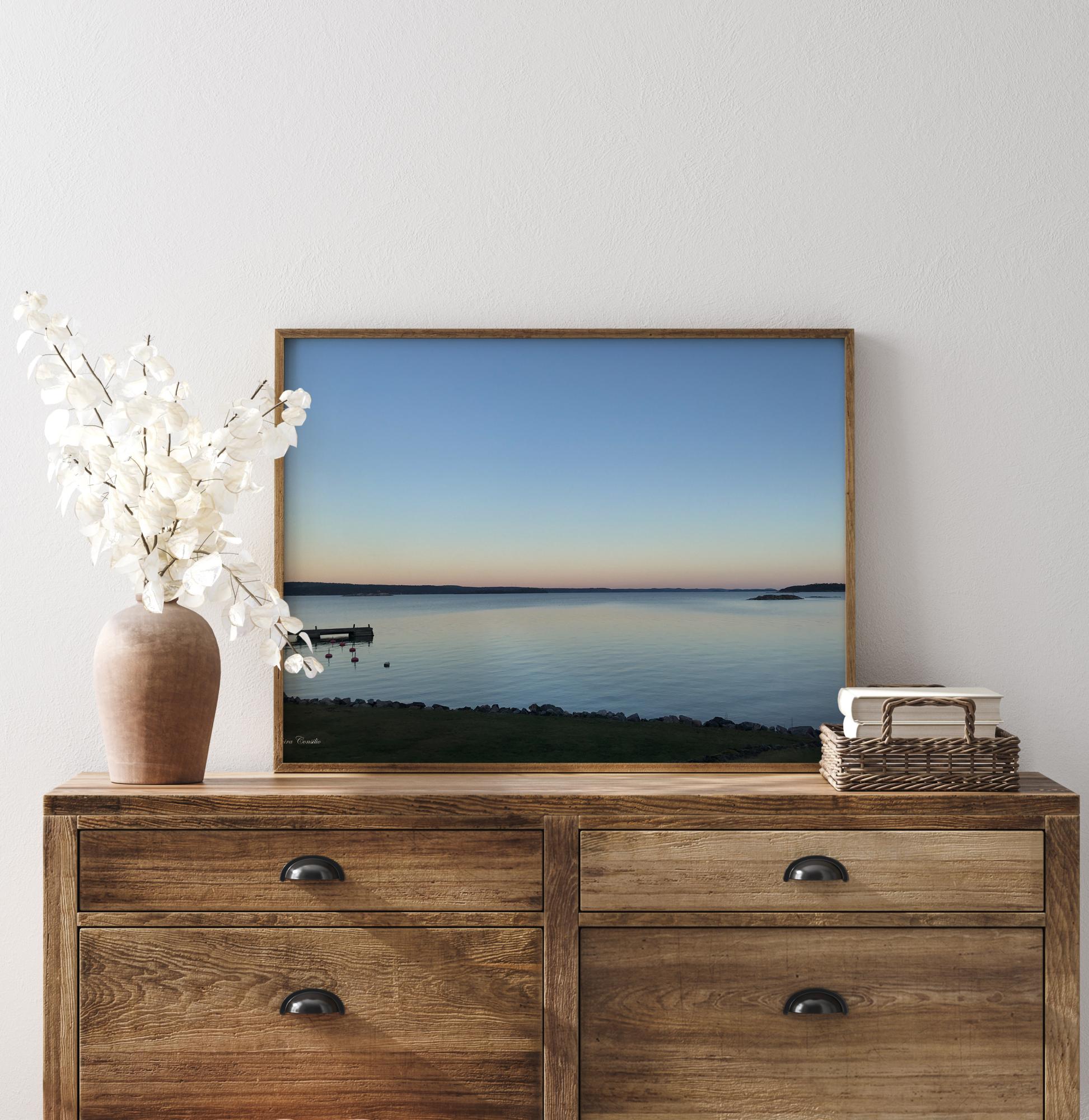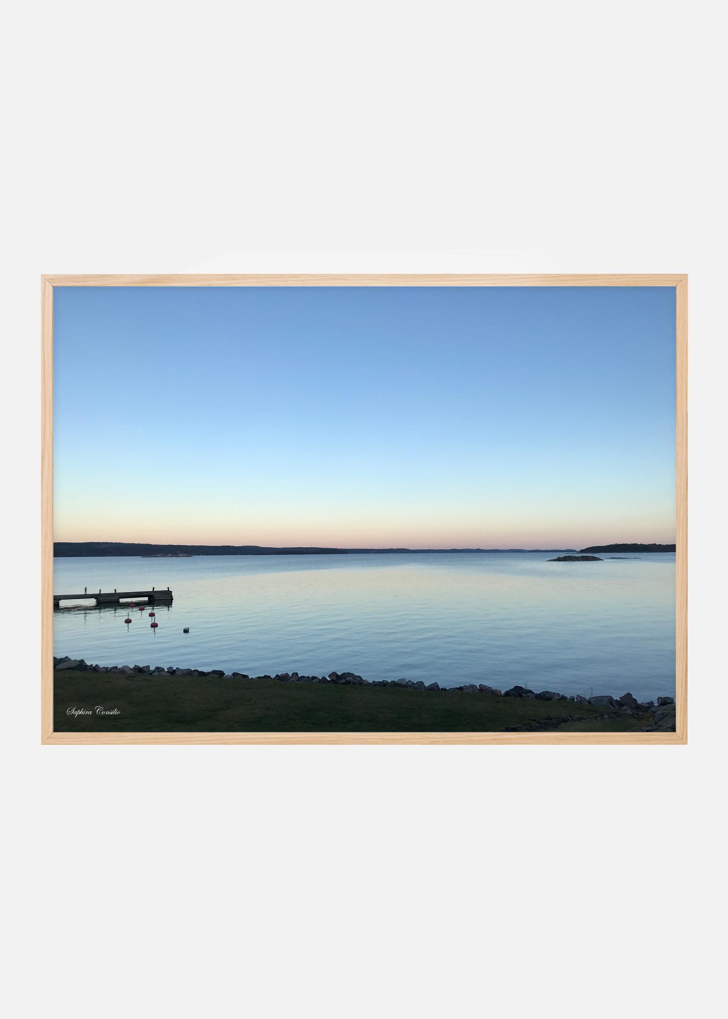 Ein fotografisches Poster der schwedischen Schären mit ihren Inseln und Klippen in wunderschönem Sonnenuntergang. Ein Steg mit seinen angrenzenden Bojen verleiht dem Bild ein wenig zusätzliches Leben. Ein herrlich beruhigendes Poster, geschaffen von der Fotografin Saphira Consilio.