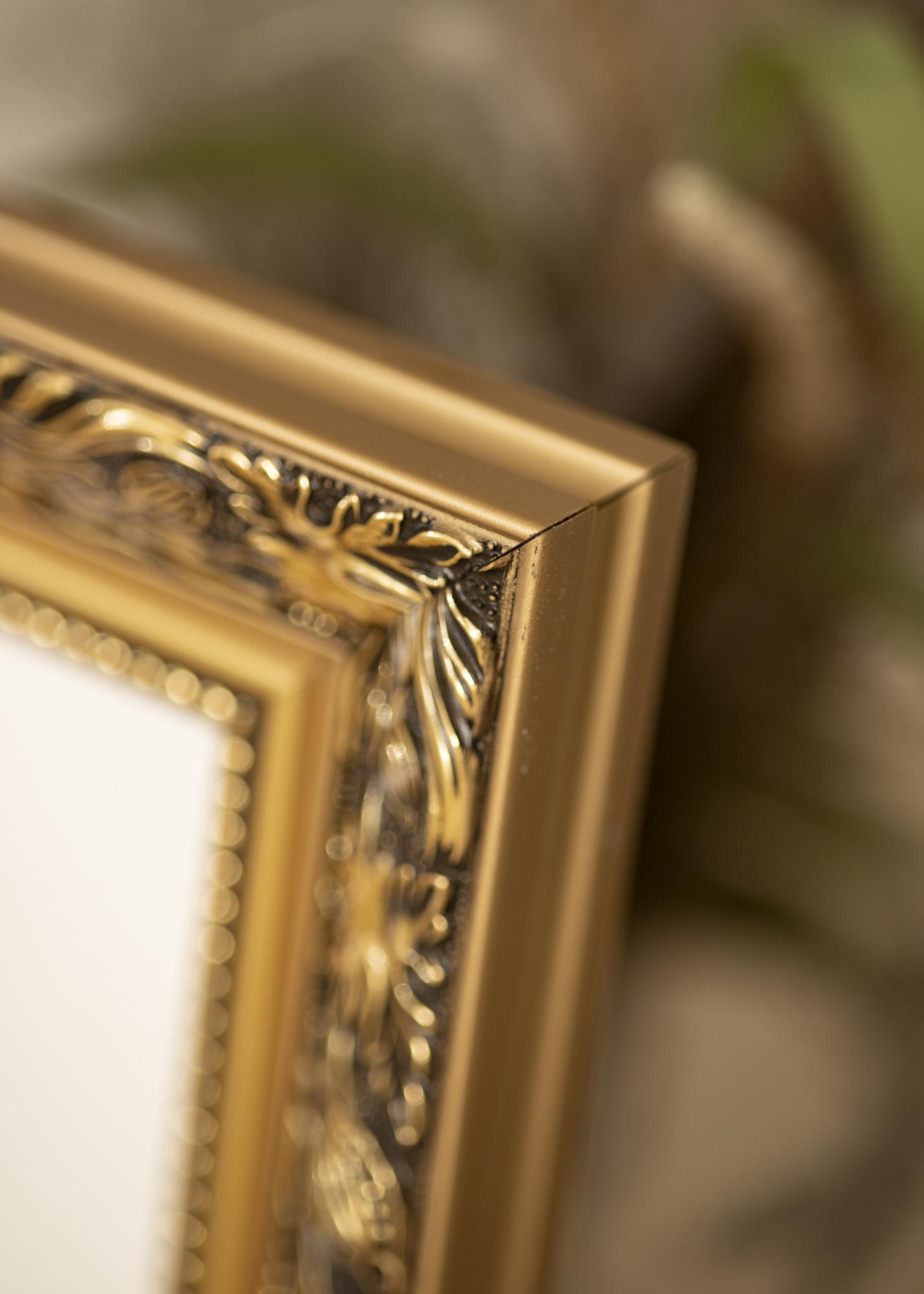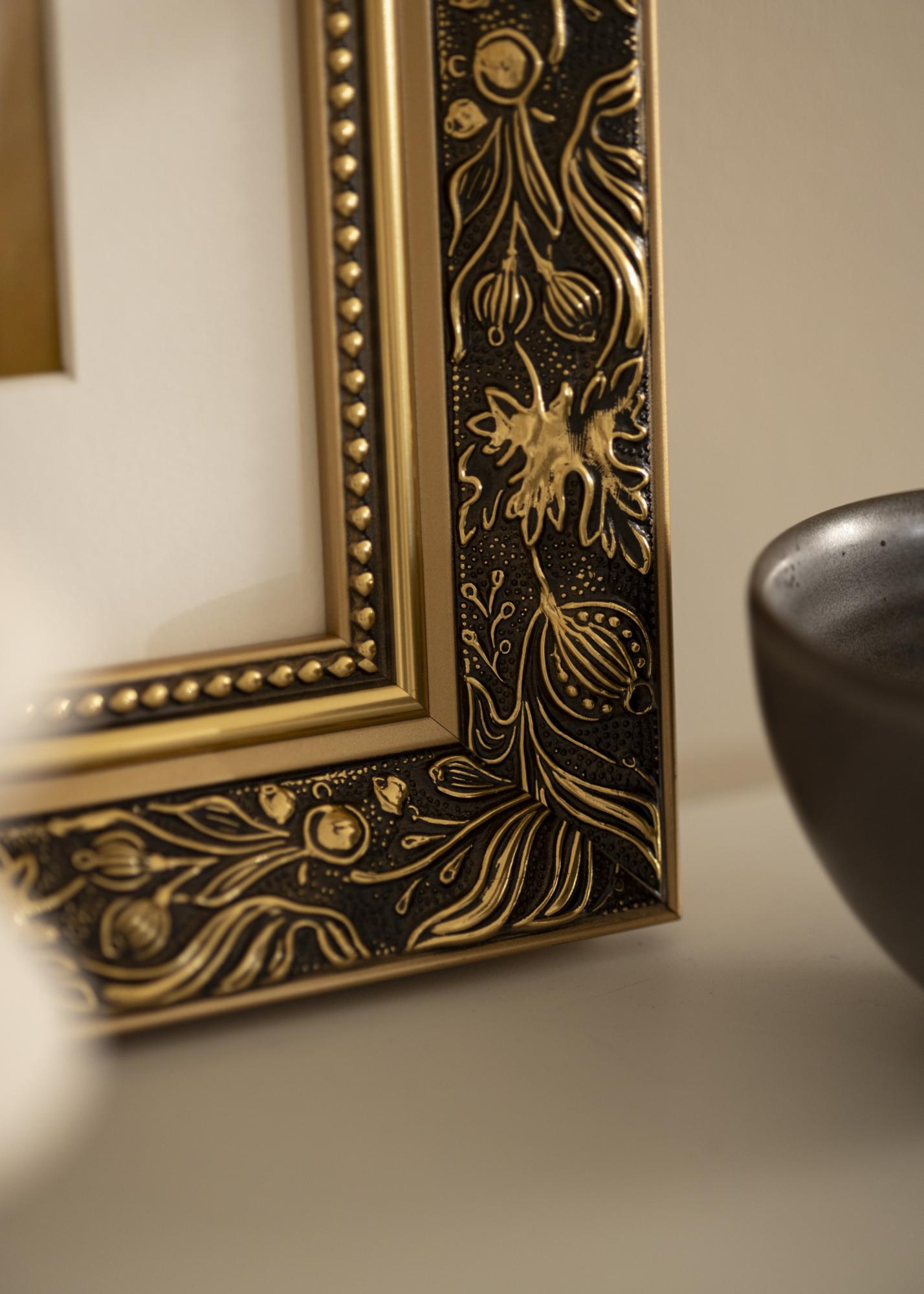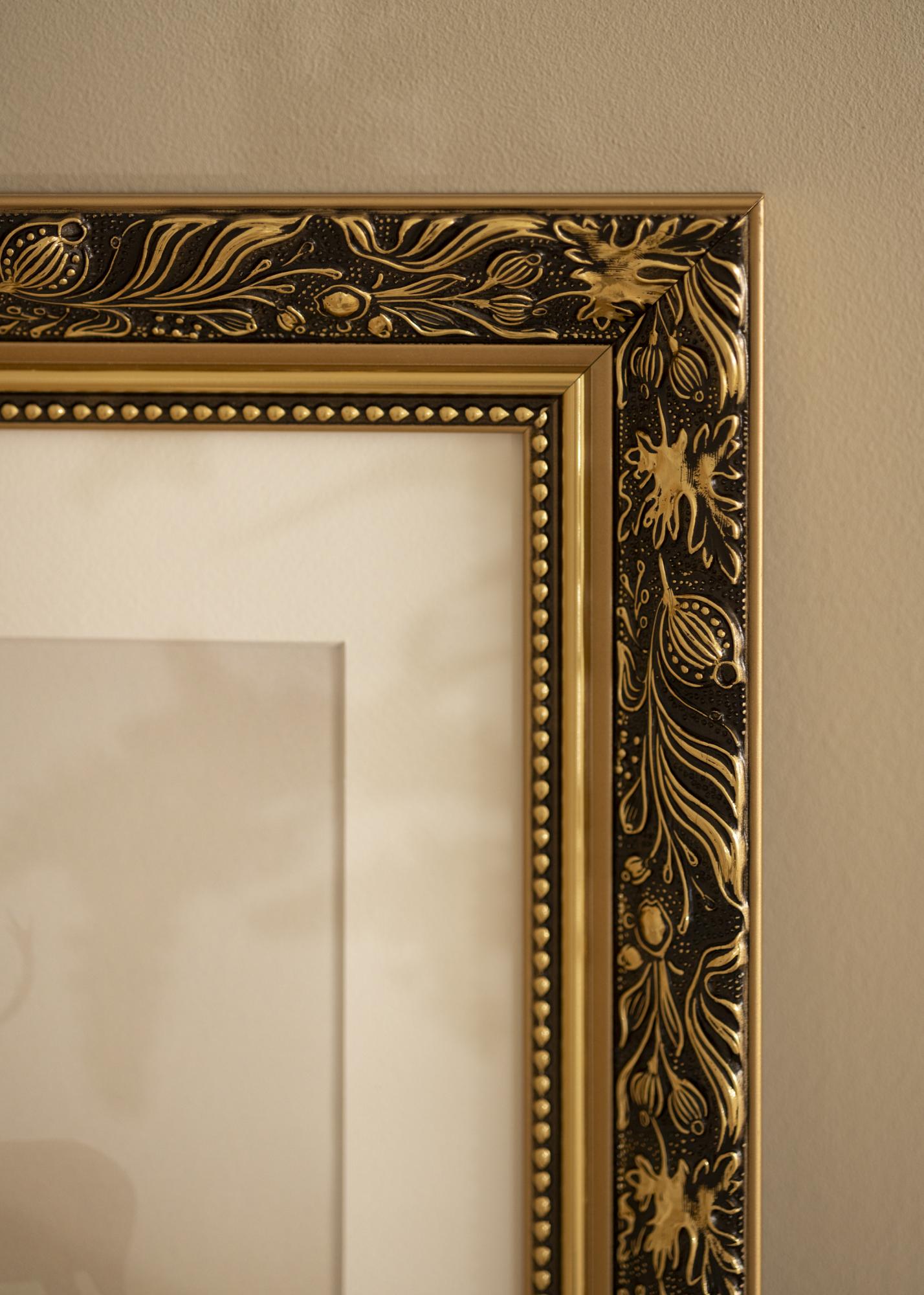 Bringe deine Bilder mit diesem luxuriösen Rahmen auf das nächste Niveau! Der Bilderrahmen ist doppelt profiliert, was sich sehr schön an der Wand macht. Die Kanten sind komplett in Gold gehalten, während die Vorderseite schwarz ist und ein goldfarbenes schönes Muster mit Blättern und gewundenen Formen aufweist. Direkt neben dem Glas verläuft eine goldfarbene Kante und ein schwarzer Teil mit einem Perlenmuster in Gold. Da der Bilderrahmen nach deinen Maßen gefertigt wird, kannst du sicher sein, dass er genau dorthin passt, wo du ihn haben möchtest.