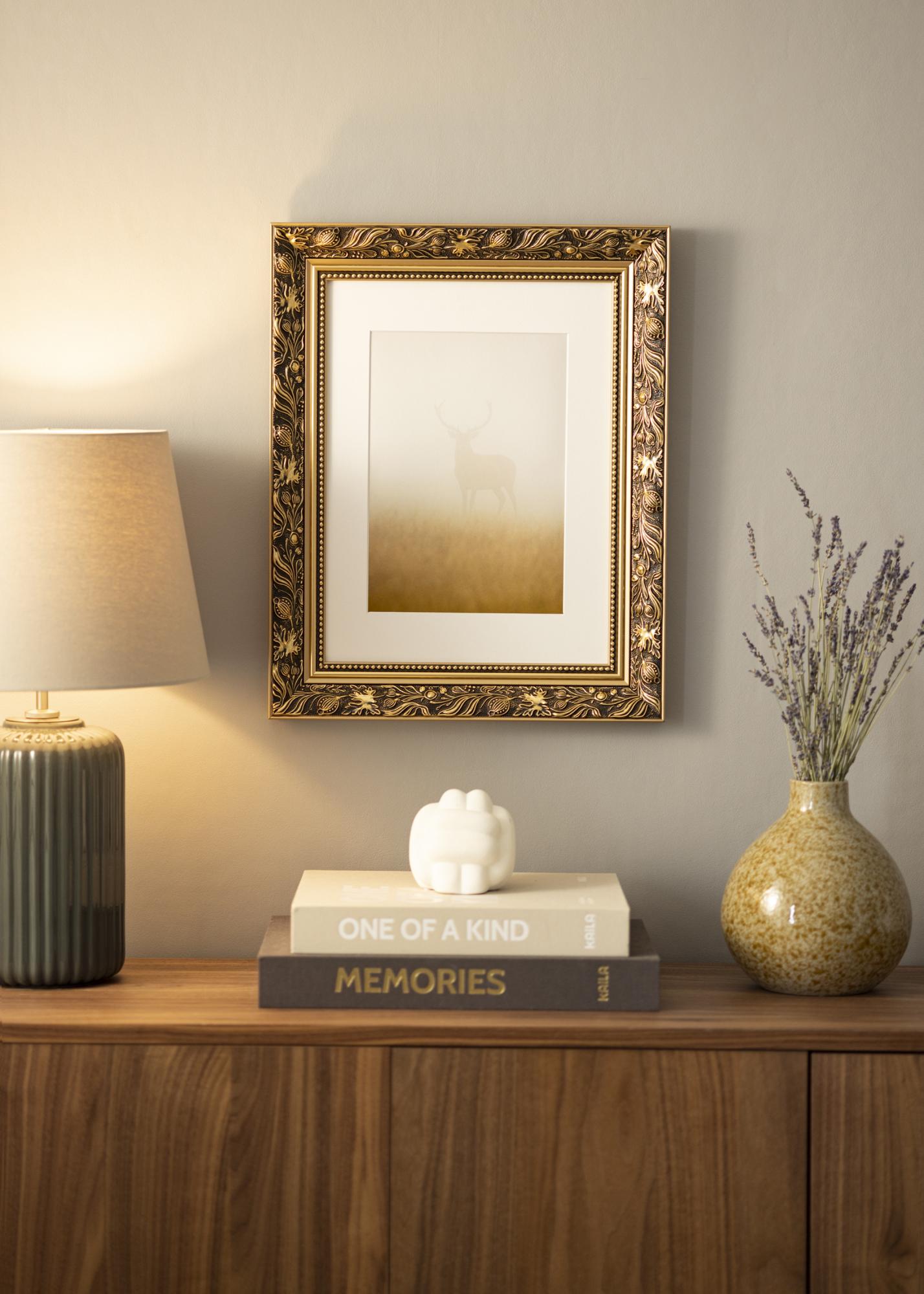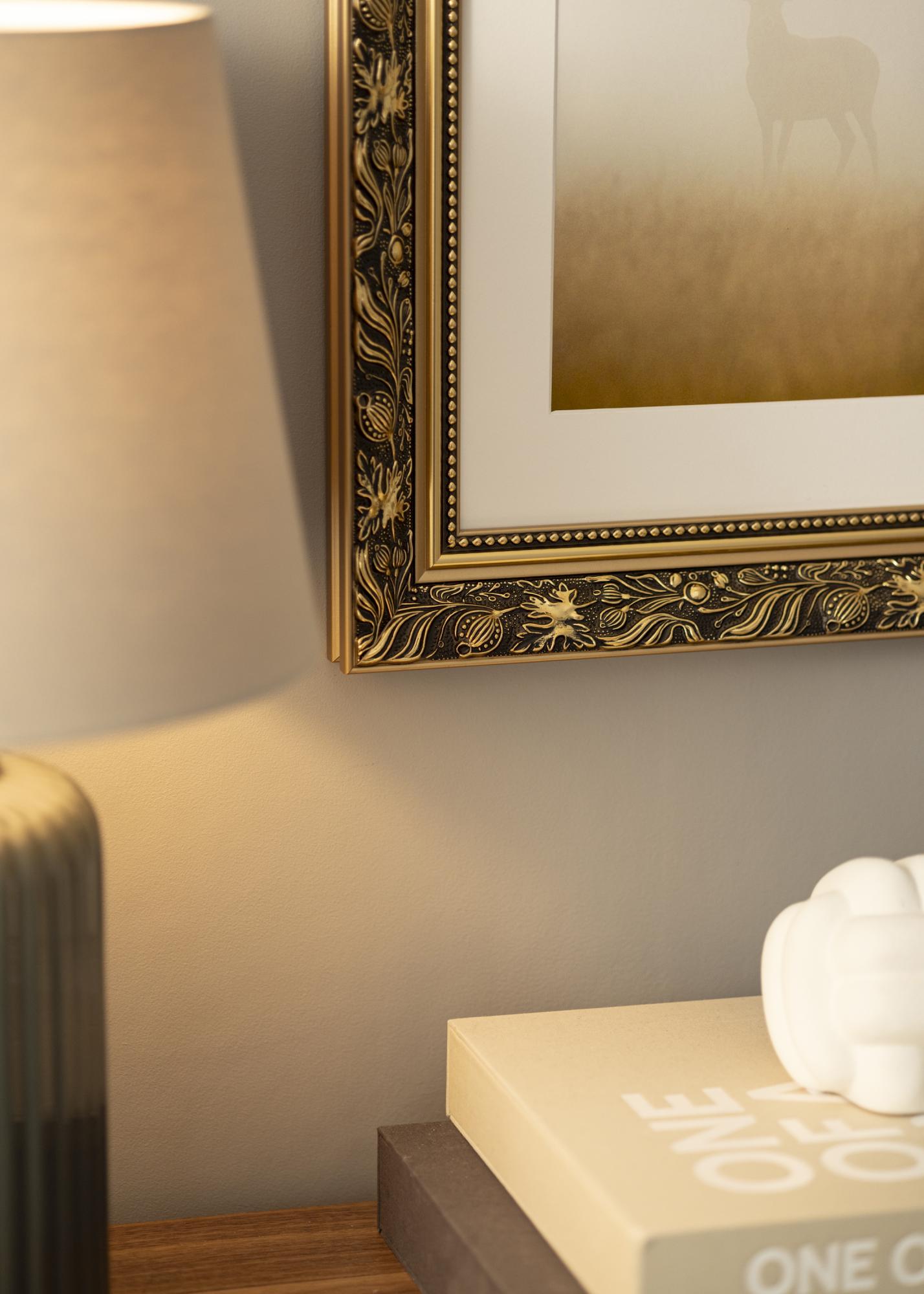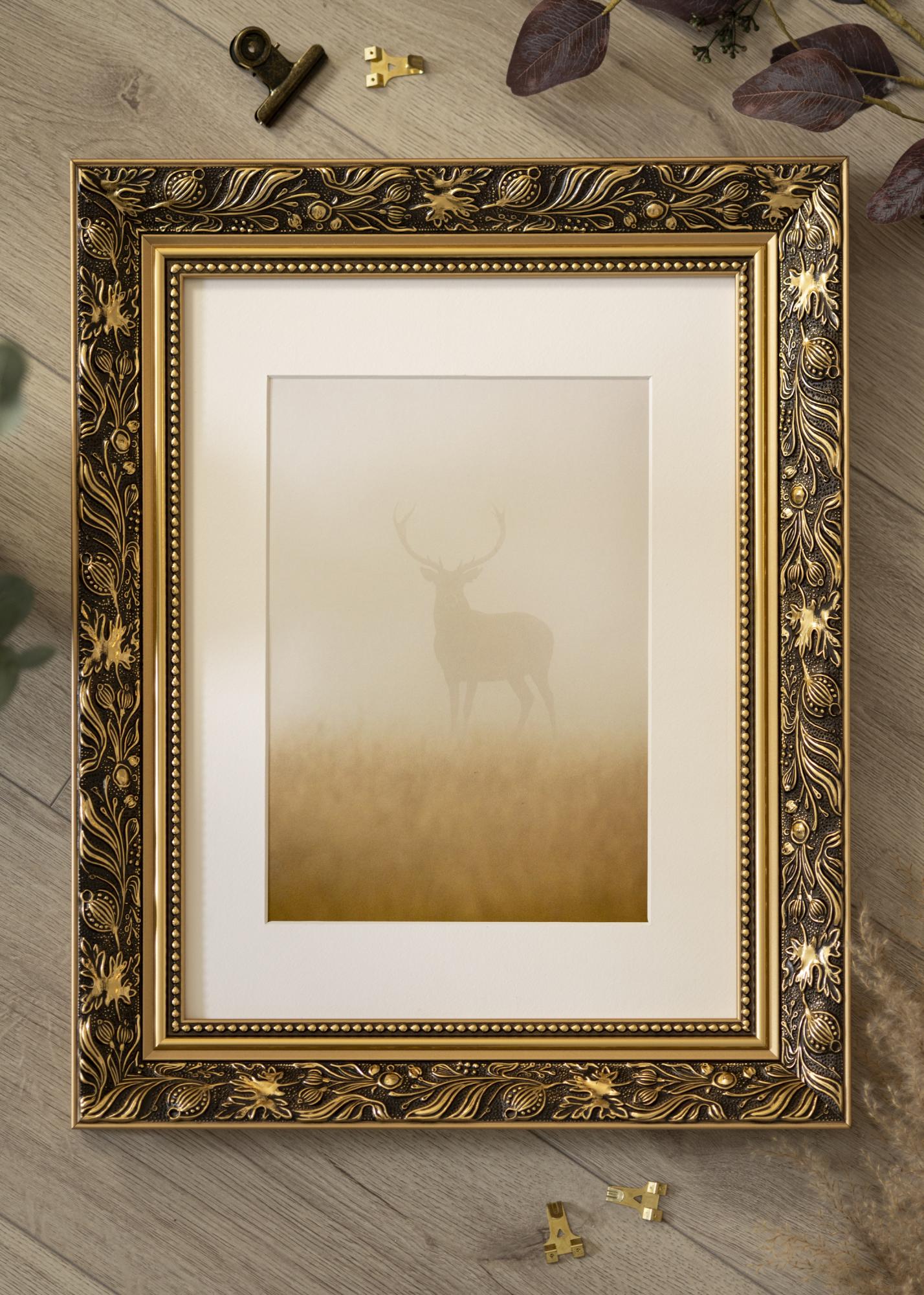 Bringe deine Bilder mit diesem luxuriösen Rahmen auf das nächste Niveau! Der Bilderrahmen ist doppelt profiliert, was sich sehr schön an der Wand macht. Die Kanten sind komplett in Gold gehalten, während die Vorderseite schwarz ist und ein goldfarbenes schönes Muster mit Blättern und gewundenen Formen aufweist. Direkt neben dem Glas verläuft eine goldfarbene Kante und ein schwarzer Teil mit einem Perlenmuster in Gold. Da der Bilderrahmen nach deinen Maßen gefertigt wird, kannst du sicher sein, dass er genau dorthin passt, wo du ihn haben möchtest.