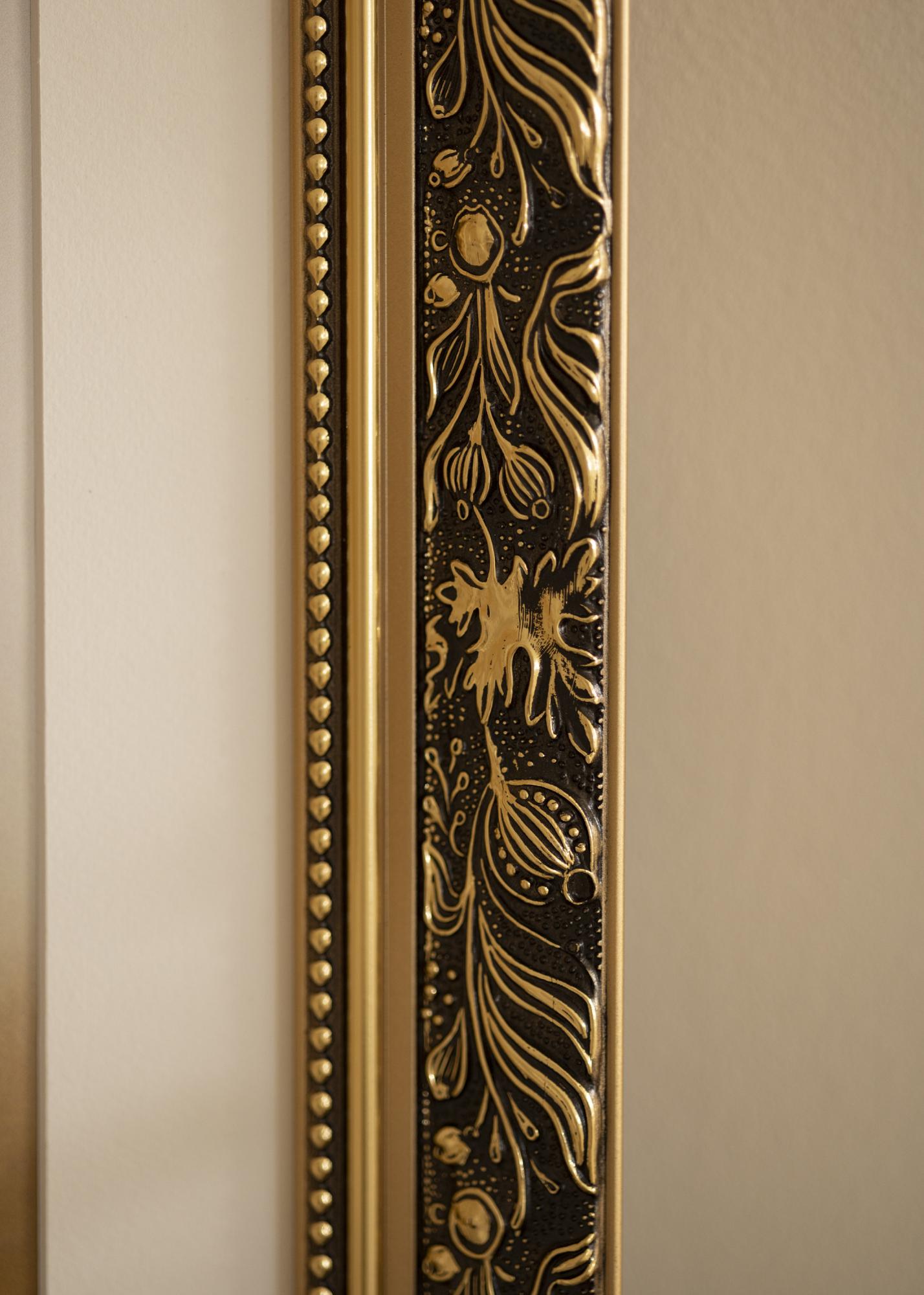 Dieser luxuriöse Bilderrahmen bringt Ihre Bilder in neue Dimensionen! Der Rahmen hat eine doppelte Profilierung, was sich an der Wand richtig gut macht. Die Kanten sind ganz in Gold, während die Vorderseite komplett schwarz mit goldenen, hübschen Mustern mit Blättern und schnörkeligen Formen verziert ist. In der Nähe des Glases grenzt eine goldfarbene Kante und ein schwarzer Teil mit einem Perlmuster in Gold. Da der Rahmen genau nach Ihrem Maßwunsch angefertigt wird, können Sie sicher sein, dass er genau dahin passt, wo Sie ihn haben möchten.