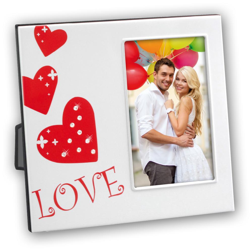 Fotorahmen aus Metall mit roten Herzen und der Aufschrift "Love" mit Platz für ein persönliches Bild im Format 10x15 cm. Ein Fotorahmen, der deinen Lieblingsfotos garantiert das richtige Gefühl verleiht.