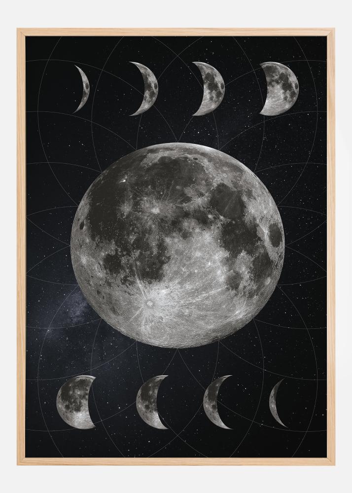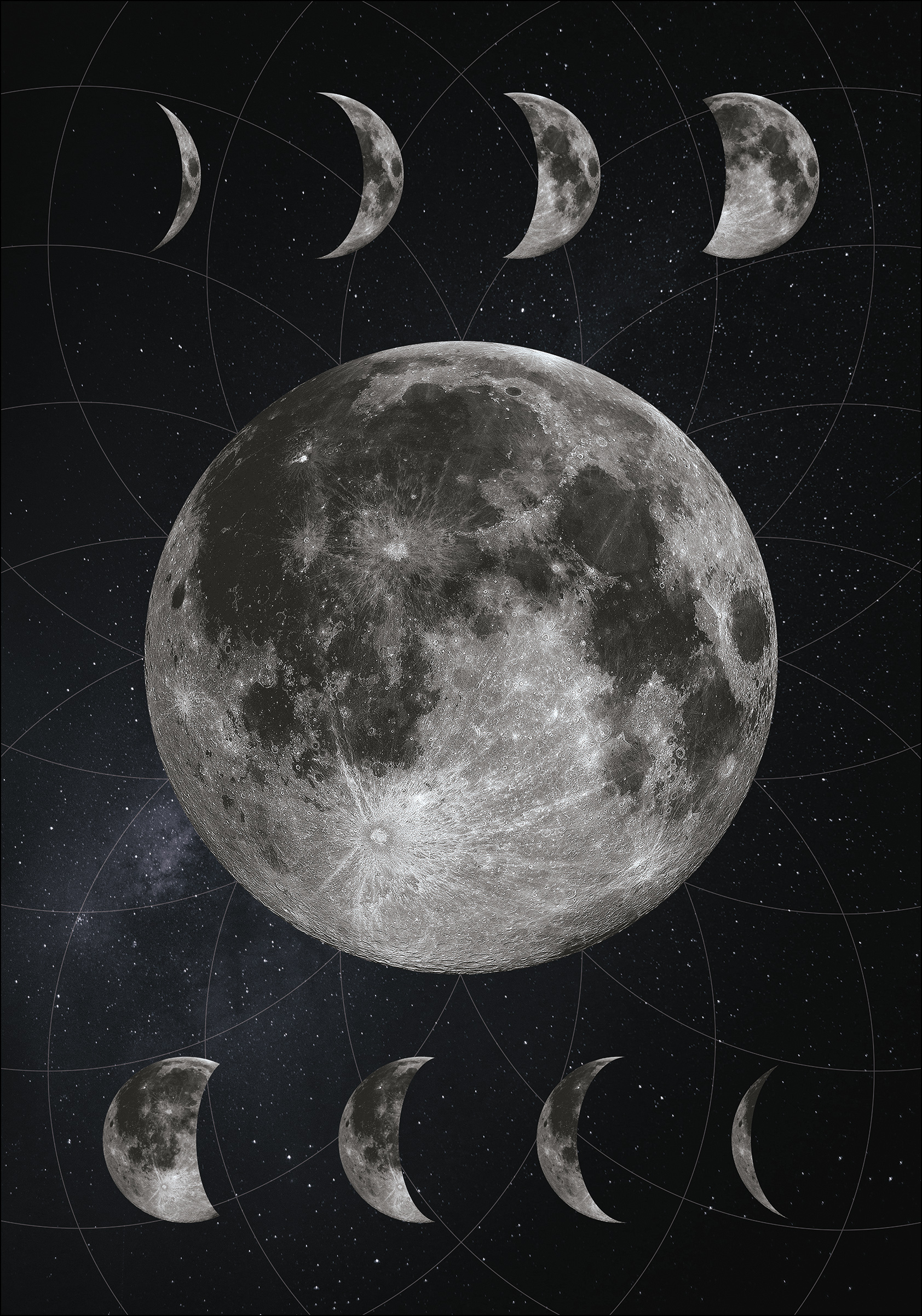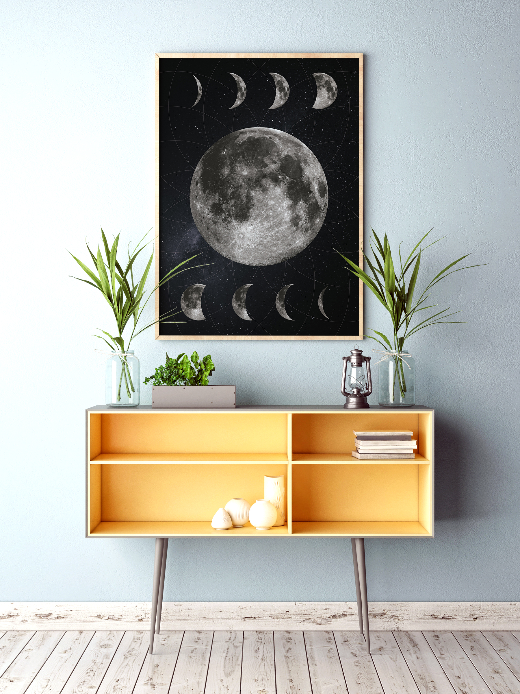 Welches ist dein Favorit unter den Himmelskörpern? Dieser stilvolle print stellt unseren wunderschönen Mond und all seine Phasen dar, wie sie je nachdem, ob du dich auf der nördlichen oder südlichen Hemisphäre der Erde befindest, aussehen. Der Mond selbst ist in Graustufen gehalten, während der Sternenhimmel dahinter leicht ins Blaue tendiert.