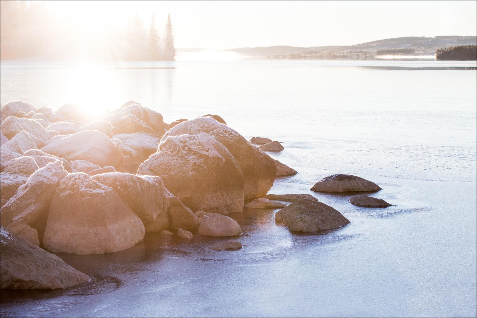 Eine blendende Landschaftsaufnahme von Felsen am Meer am frühen Morgen. Das Meerwasser reflektiert das Sonnenlicht durch die braunen Felsen, so dass eine weiße Oberfläche entsteht. Mit dem Flachland im Hintergrund wird dieser Druck sicherlich Ihr Wohnzimmer erhellen.