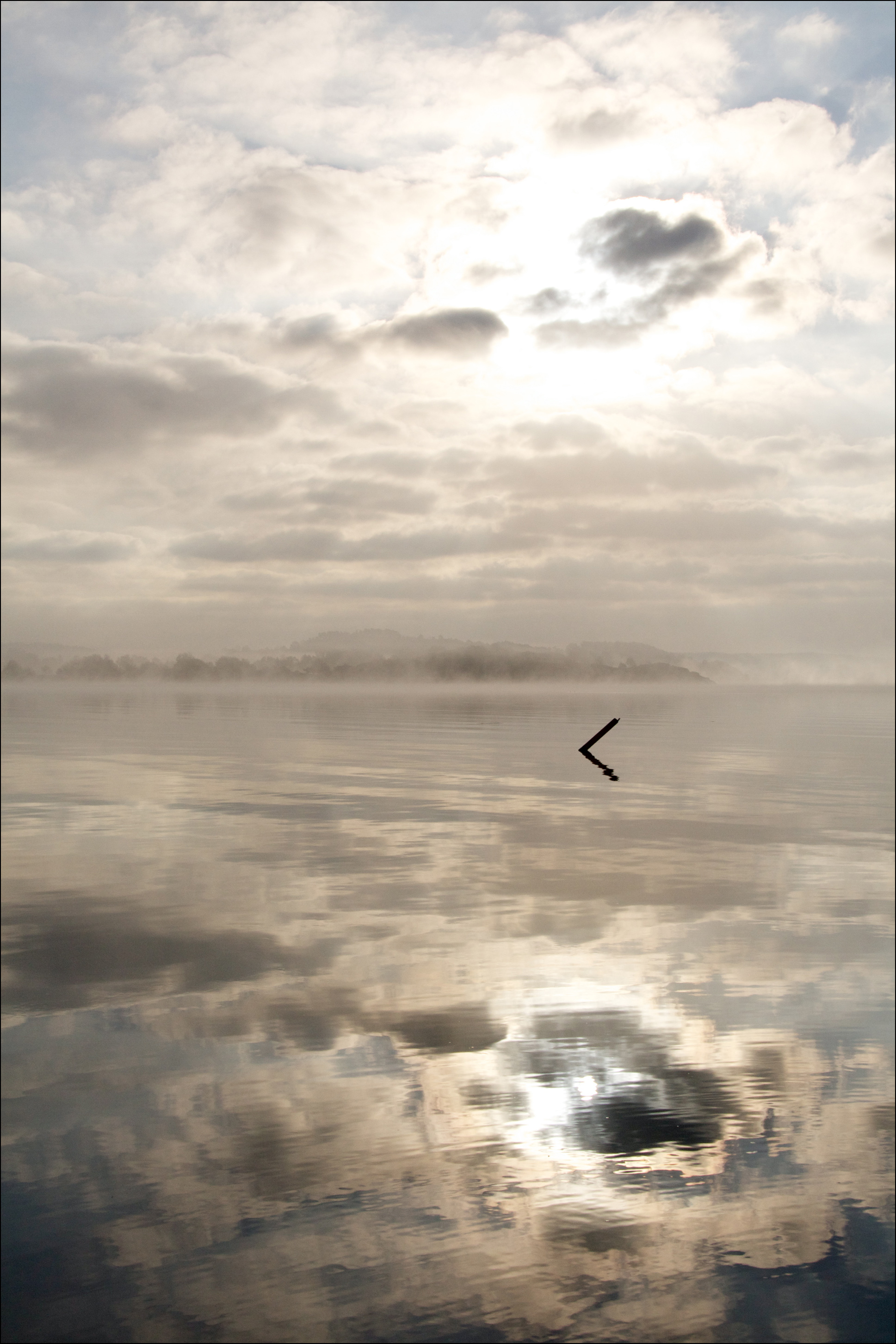 Ein ruhiges Naturfoto, das tanzende Elfen und einen wolkenbedeckten Himmel zeigt, der sich in einer leicht gekräuselten Wasseroberfläche spiegelt. Ein ruhiges und harmonisches Poster, das überall dort hervorragend passt, wo Sie ein beruhigendes Element wünschen.