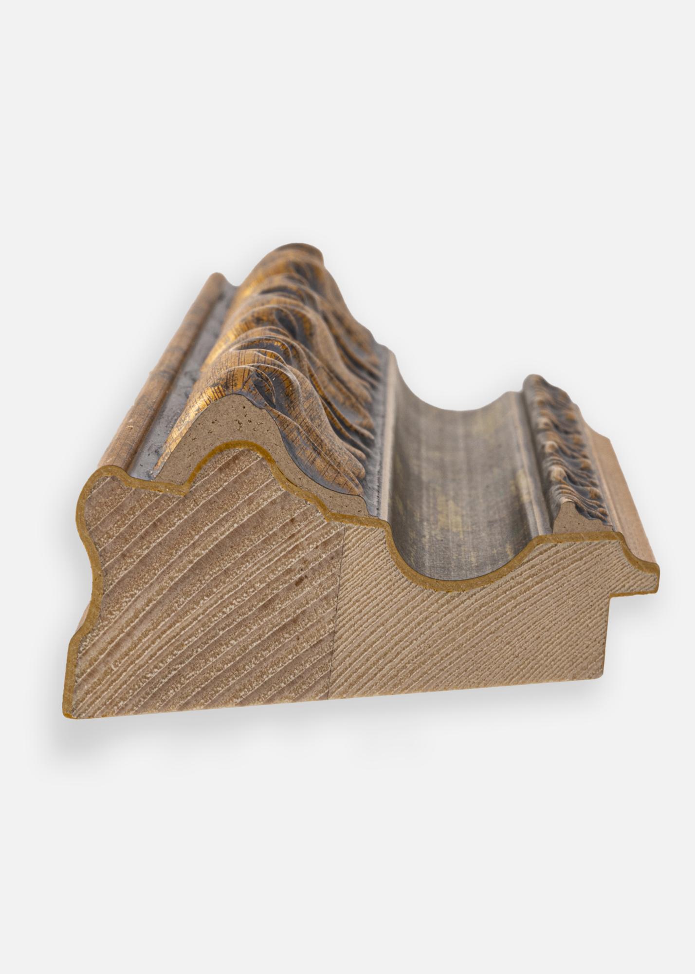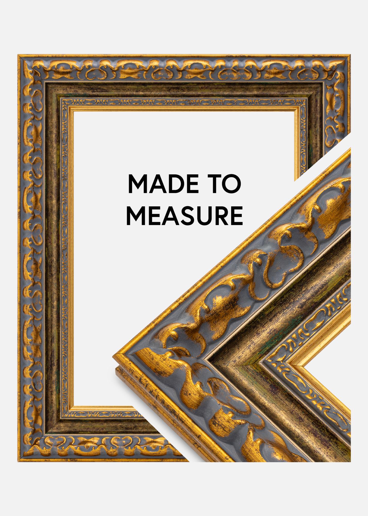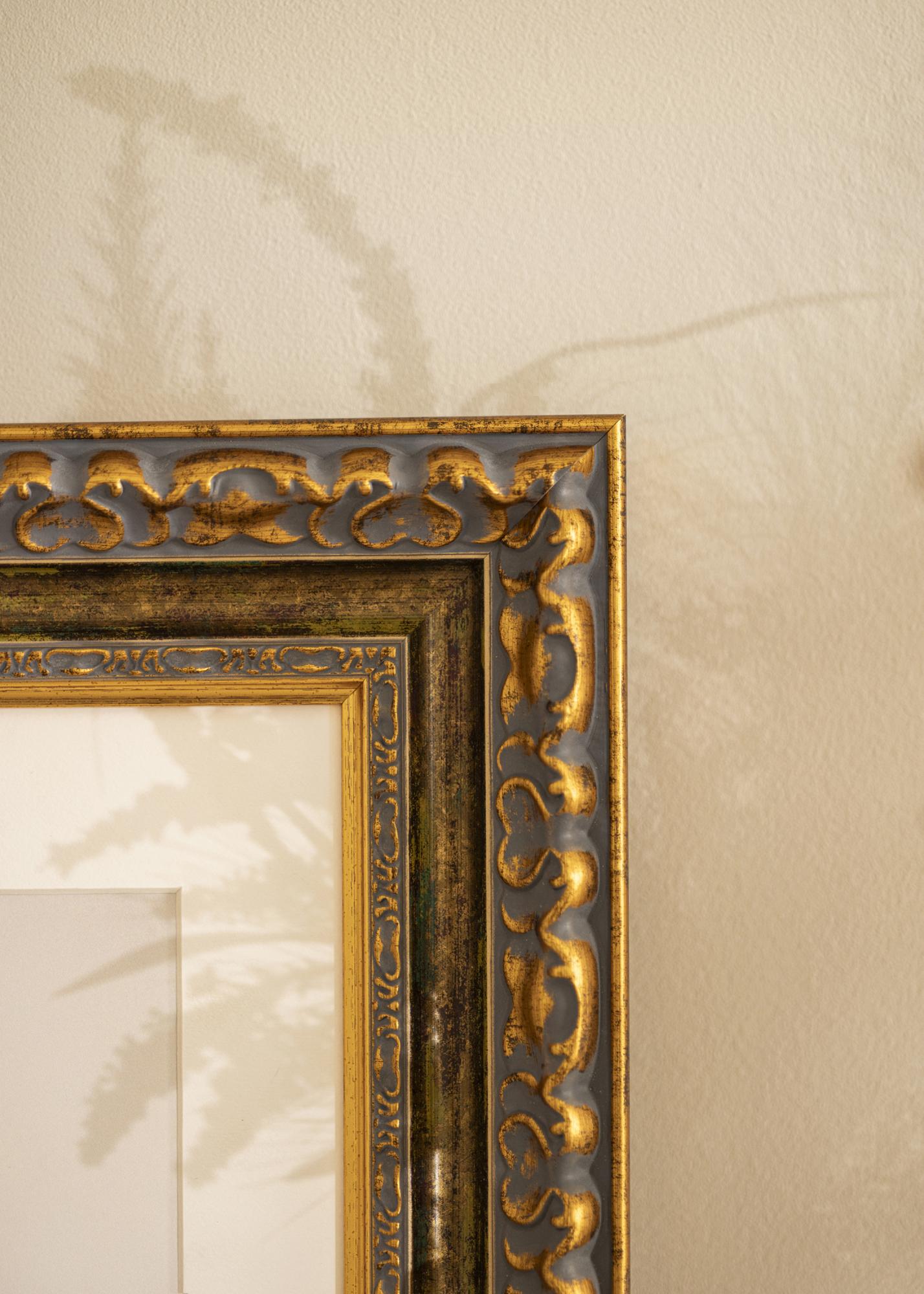 Möchtest du ein schönes Bild aus einem alten Familienfoto oder einem schönen Bild der Familie kreieren? Dieser luxuriöse Bilderrahmen verleiht Charakter und erregt Aufmerksamkeit! Der Bilderrahmen hat einen tollen abgenutzt wirkenden Look mit Mustern aus abwechslungsweise Gold und Grau und Gold, Grün und Braun. Da die Herstellung in unserer eigenen Rahmenwerkstatt erfolgt, kannst du dir sicher sein, einen schönen und hochwertigen Rahmen zu erhalten.