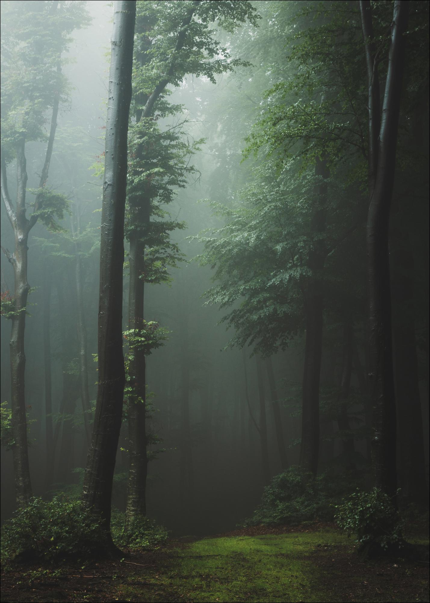 Ein beruhigendes Naturfoto eines üppigen Waldes mit einem schönen Lichteinfall, der ein spannendes Spiel von Schatten erzeugt. Ein dunkelgrünes Poster geladen mit einer herrlichen Mischung aus Mystik und Harmonie.