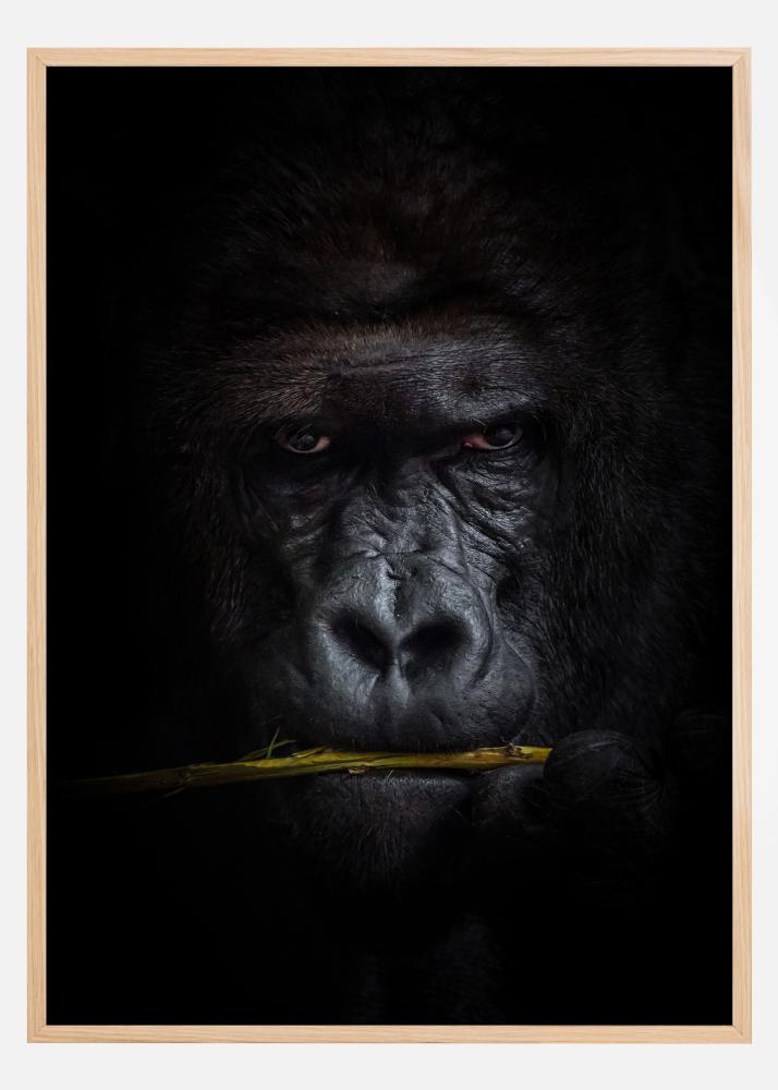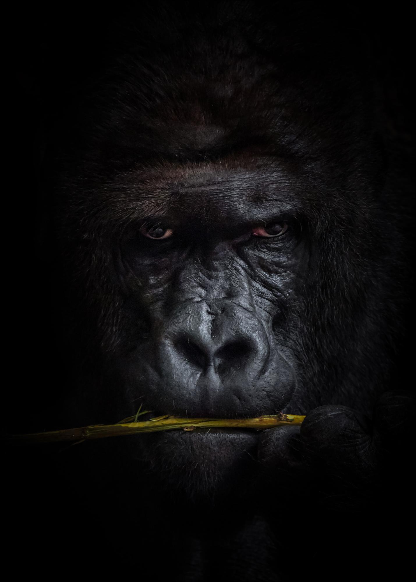 Ein Nahaufnahme-Porträt eines Gorillas, der die Rinde von einem Ast nagt. Der Blick ist auf den Fotografen gerichtet und das dunkle Fell verschmilzt mit dem schwarzen Hintergrund und schafft eine wunderbare Tiefe des Motivs. Ein mächtiges poster mit einer intimen Begegnung mit einem der größten Primaten des Regenwaldes.