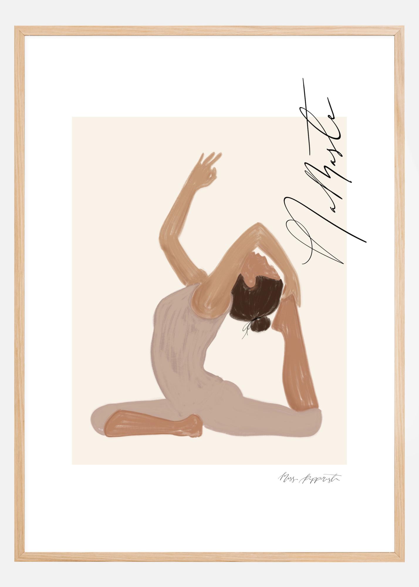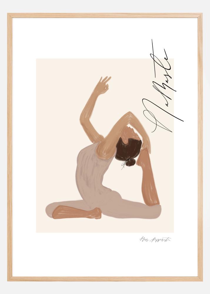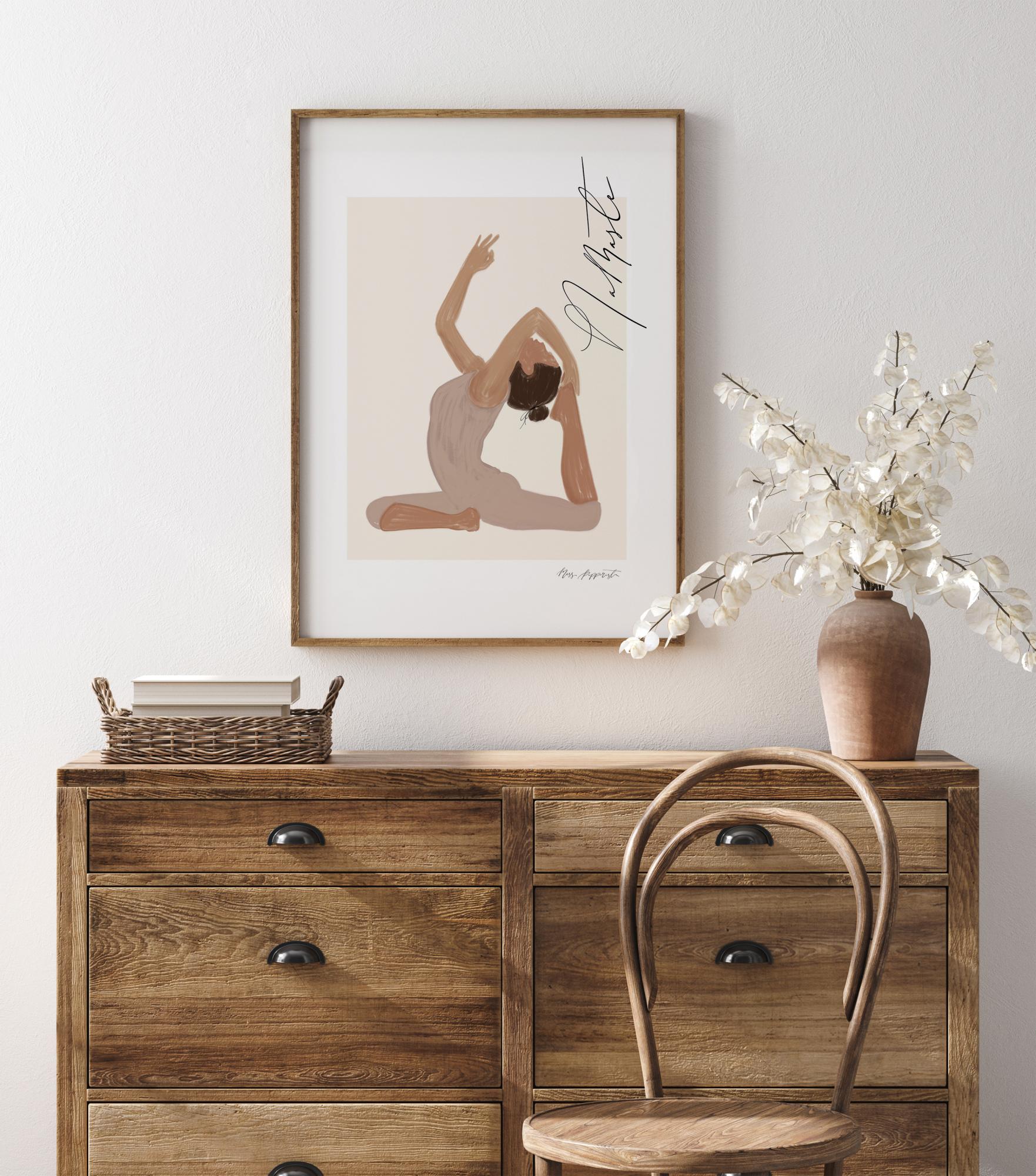 Ein grafisches Poster in sanften Pastelltönen, das eine Frau in einer Yoga-Pose zusammen mit der Botschaft "Namaste" (Ich verneige mich vor dir) in schöner Kalligraphie darstellt. Ein harmonisches und ruhiges Motiv, das in einen breiteren Passepartout in Weiß gerahmt und hervorgehoben wurde, erstellt von Jenny Skantz, Miss Papperista.