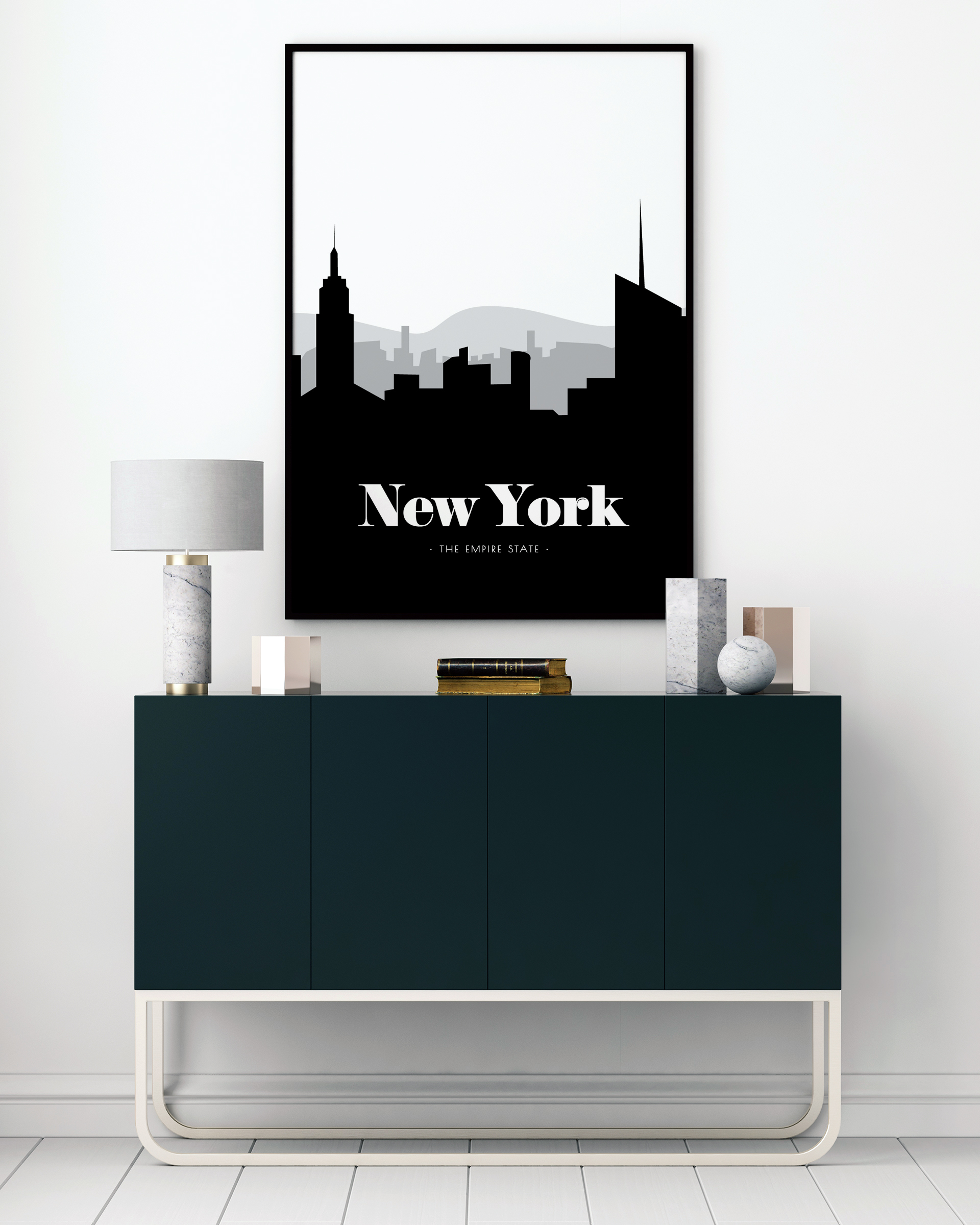 Die lebendigste, lauteste und aufregendste Stadt der Welt muss New York sein! Feiern Sie diese wunderbare Metropole mit diesem grafischen Plakat und lassen Sie es zu einem stilvollen Bestandteil Ihres Interieurs werden. Das Poster stellt Silhouetten in 3 verschiedenen Schichten dar, wobei die hintere grau und die 2 vorderen dunkler grau bzw. schwarz sind. In der vorderen Silhouette können Sie unter anderem das Empire State Building und das Rockefeller Center erkennen. Gegen das Schwarze steht der Text „New York, The Empire State“ in weißem Druck. Die New York Skyline ist in 6 verschiedenen Formaten und Preisklassen erhältlich. Ergänzen Sie es gerne mit einem weißen Rahmen.