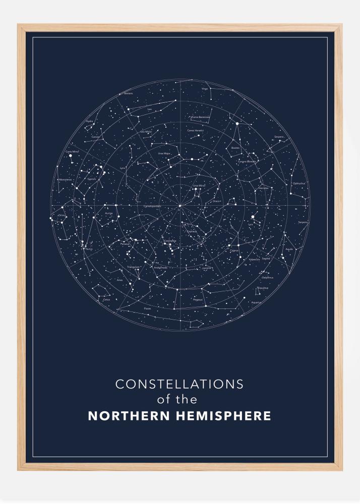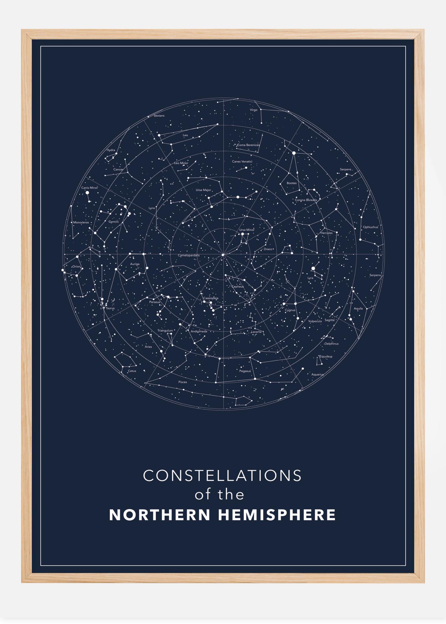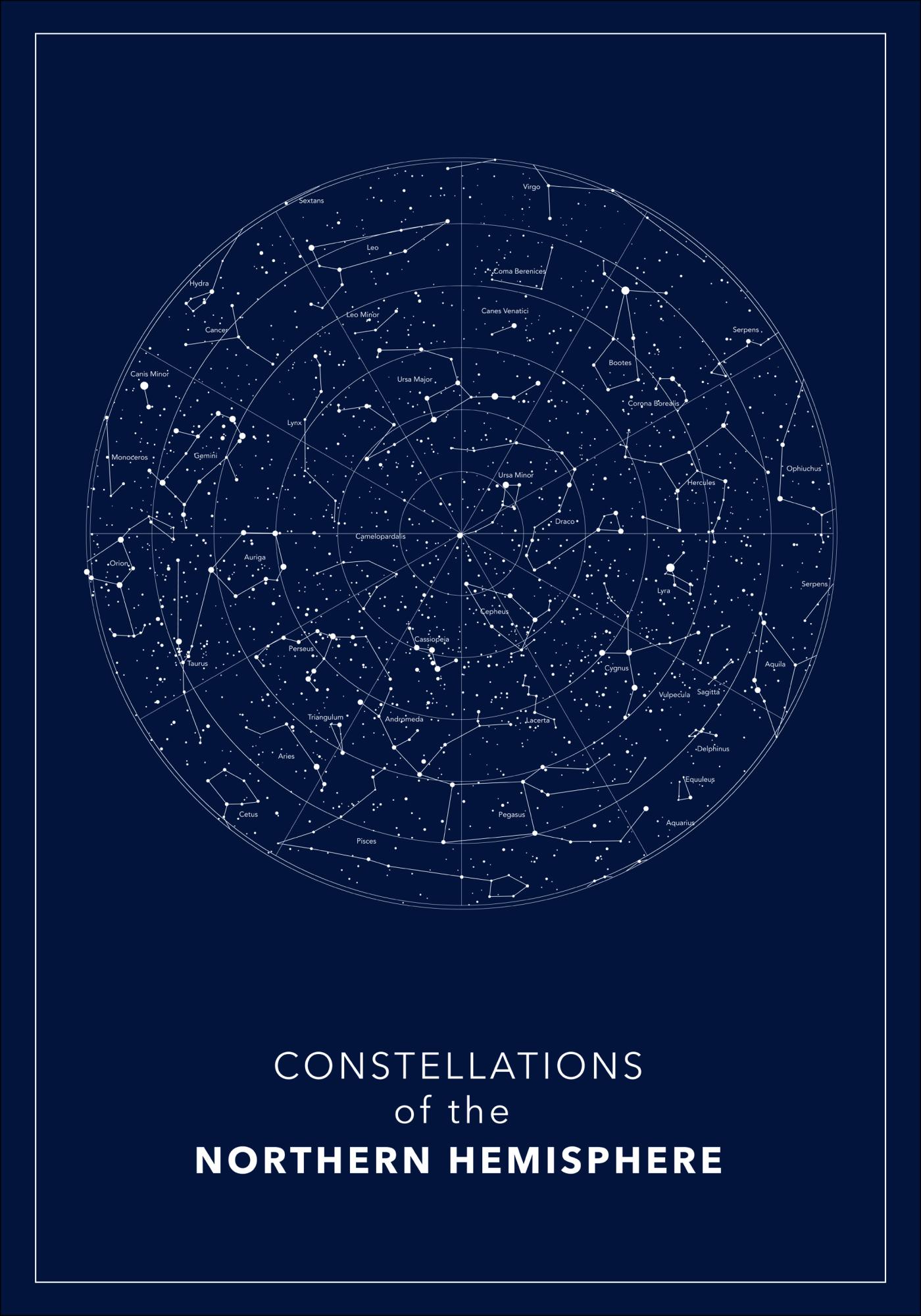 Ein glitzerndes Poster mit einem weißen Kreis und den Sternbildern der nördlichen Hemisphäre. Die Sternbilder sind mit einer schwachen weißen Linie hervorgehoben, unter der jeweils der Name steht. Auf einem dunkelblauen Hintergrund wird die nördliche Hemisphäre sehr anschaulich erklärt. Ein idealer Druck zum Aufhängen in einem Atelier.