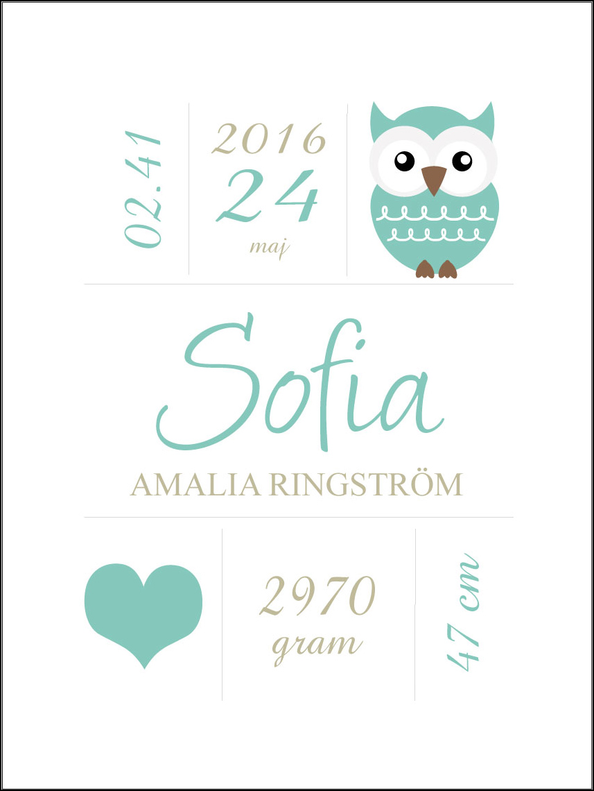 Owl Birth Poster Turquoise (21x29,7 cm (A4))