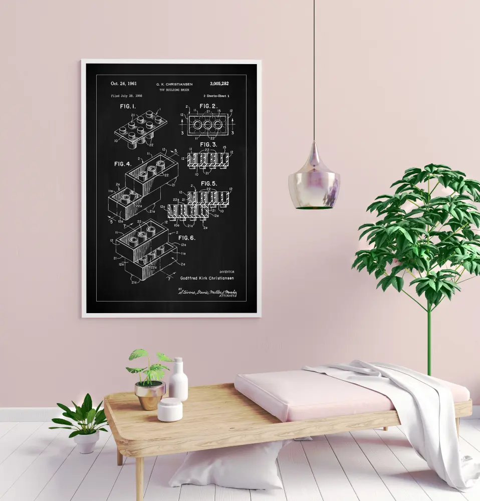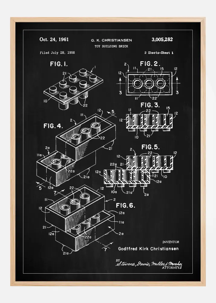 Dieses Patentposter zeigt das ursprüngliche Design des revolutionären Spielzeugbausteins von Lego, einer Erfindung, die zum Grundstein kreativen Spielens auf der ganzen Welt wurde. Das Patent mit der Nummer 3,005,282 wurde am 24. Oktober 1961 dem Erfinder Godtfred Kirk Christiansen erteilt und stellt ein Wahrzeichen sowohl in der Design- als auch in der Spielzeuggeschichte dar.
