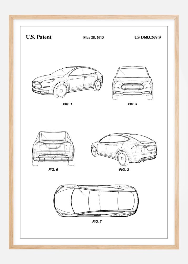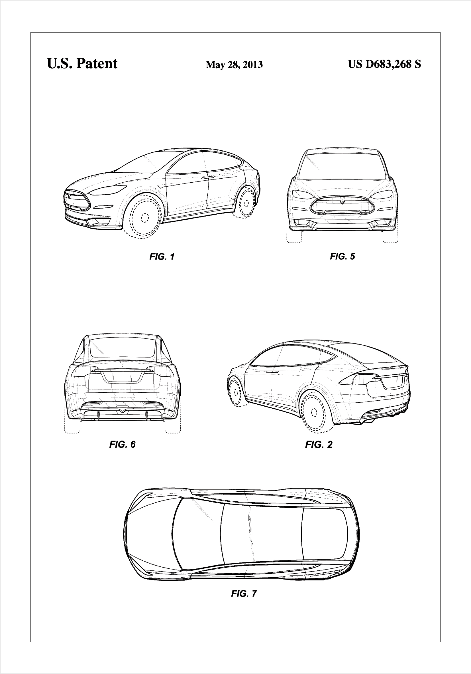 Entdecken Sie eine Welt der Innovation und des Stils mit diesem unverwechselbaren Patentaushang eines Tesla, der stolz das Patentnummer US D683,268 S präsentiert, erteilt am 28. Mai 2013. Dieses minimalistische und elegante Patentposter hebt ein revolutionäres Fahrzeugdesign hervor, das den technologischen Fortschritt und das industrielle Design repräsentiert. Das Poster fasziniert mit seinen scharfen Linien und präzisen Details, was es zu einem herausragenden Einrichtungsstück in jedem modernen Zuhause oder Büro macht.