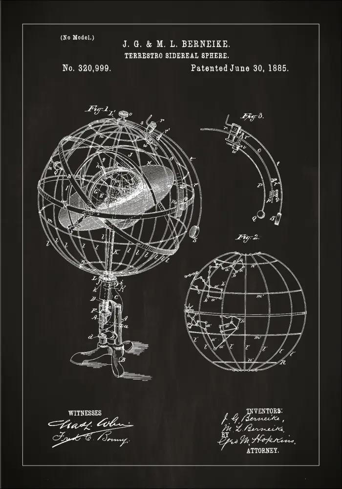 Dieses einzigartige Patentposter zeigt eine einfallsreiche und detaillierte Patentzeichnung einer Terrestro Sidereal Sphere, patentiert am 30. Juni 1885 von J.G. & M.L. Berenike. Das komplizierte Design hebt die technische Fähigkeit der Innovationen des 19. Jahrhunderts hervor und vermittelt ein Gefühl der Geschichtsträchtigkeit. Die Illustration besteht aus komplexen geometrischen Formen, die zusammenwirken, um ein Modell der Bewegung von Himmelskörpern in Bezug auf die Erde zu erzeugen, was das faszinierende astronomische Wissen der damaligen Zeit reflektiert.