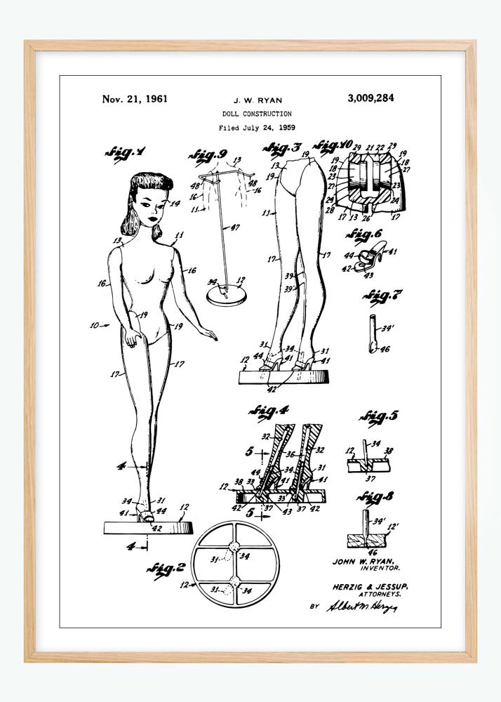 Dieses einzigartige Patentposter offenbart die Konstruktion einer Barbie-Puppe, die am 21. November 1961 unter der Nummer 3,009,284 patentiert wurde. Erfunden von J.W. Ryan und eingereicht am 24. Juli 1959, zeigt die Zeichnung die einzigartigen Teile und Verbindungen der Puppe, ein faszinierendes Beispiel für Spielzeugdesign und Innovation in der Mitte des 20. Jahrhunderts. Das Poster ist ein erstklassiges Gesprächsstück, perfekt für Sammler oder als verspieltes Dekorationselement in einem kreativen Raum.
