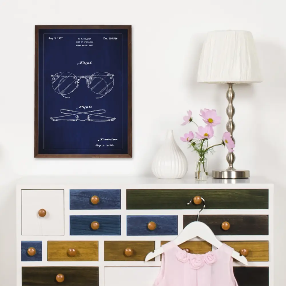 Dieses Patentposter ist nicht nur eine Hommage an die Innovation in der persönlichen Augenpflege, sondern auch eine interessante Ergänzung für die Sammlung derer, die Vintage-Accessoires und Industriedesign schätzen. Es ist ideal für Optikerpraxen, Designstudios oder als geschmackvolles Detail in einem Zuhause oder Büro. Diese Patentskizze bietet einen zeitlosen Charme und einen Gesprächsstarter für Besucher und Betrachter.