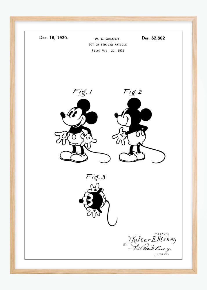 Dieses Patentplakat hebt eine Micky Maus hervor, gestaltet von W.E. Disney und am 16. Dezember 1930 unter der Patentnummer Des. 82,802 erteilt. Die drei Illustrationen präsentieren verschiedene Ansichten der Figur, die die ikonischen Eigenschaften und den Charme des Designs zeigen. Dieses Motiv ist ein wichtiges Dokument aus einer Zeit, als Spielzeugdesign begann, eine größere Rolle in Populärkultur und Massenmedien zu spielen.