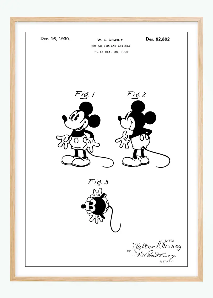 Dieses Patentposter hebt eine Micky Maus hervor, entworfen von W.E. Disney und gewährt am 16. Dezember 1930, unter der Patentnummer Des. 82,802. Die drei Illustrationen präsentieren verschiedene Ansichten der Figur, die die ikonischen Merkmale und den Charme des Designs zeigen. Dieses Motiv ist ein wichtiges Dokument aus einer Zeit, in der Spielzeugdesign begann, eine größere Rolle in der Populärkultur und den Massenmedien zu spielen.