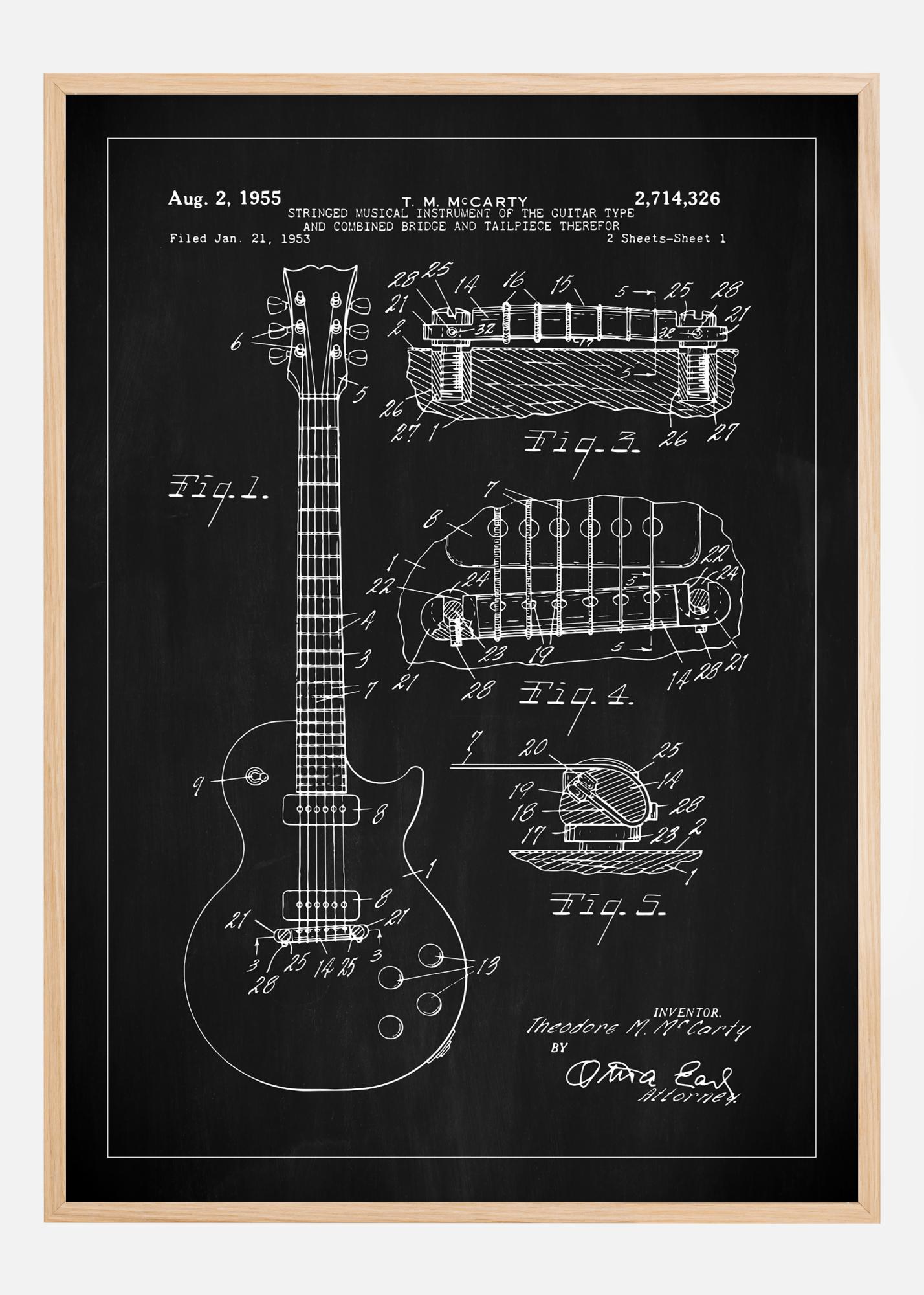 Von Kopf bis Körper, jeder Teil der Gitarre ist sorgfältig dargestellt und nummeriert, um ihre Komponenten und Konstruktionsdetails hervorzuheben, einschließlich der kombinierten Brücke und des Sattels. Diese Patentskizze ist eine Hommage an musikalische Innovation und Design und ein Muss für alle Musikliebhaber und Sammler von Musikgeschichte. Als Wandkunst bietet dieses Patentposter nicht nur ästhetischen Genuss, sondern auch eine Wertschätzung für die technischen Fortschritte, die die Musikindustrie geprägt haben.