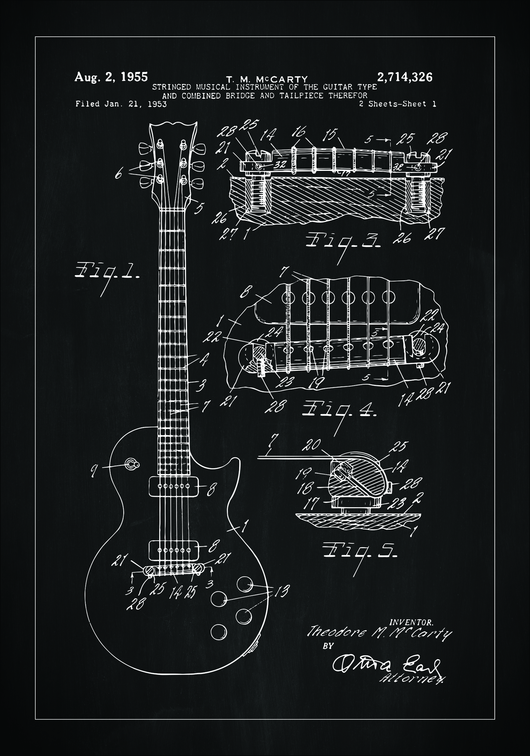 Dieses Patentposter zeigt ein klassisches Saiteninstrument-Design, insbesondere eine E-Gitarre, mit dem Datum 2. August 1955 und der Patentnummer 2.714.326. Das Patent wurde am 21. Januar 1953 von Theodore M. McCarty eingereicht und präsentiert die elegante Form und die einfallsreiche Mechanik des Gitarrendesigns. Die Illustration, mit ihrer detaillierten Ansicht der Vorderseite des Instruments, Schnittansichten und Komponentendetails, zeigt die zeitlose Schönheit und das handwerkliche Können hinter diesem Musikinstrument.