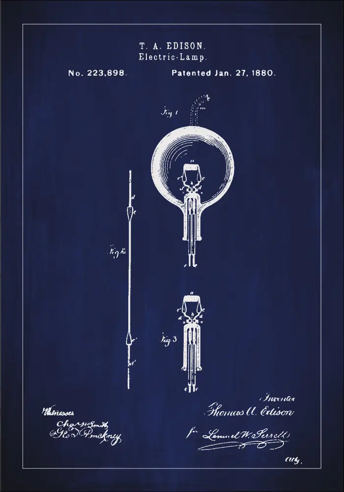 Edisons elektrische Lampe repräsentiert nicht nur einen revolutionären technischen Erfolg, sondern ist auch ein Symbol für Innovation und Fortschritt. Dieses Patentplakat wird sicherlich Gespräche und Neugier bei allen Betrachtern wecken und ist ein perfektes Geschenk für diejenigen, die eine Leidenschaft für Wissenschaftsgeschichte haben oder den kreativen Geist der Menschheit ehren möchten. Mit seinem klassischen Aussehen und seinem zeitlosen Charme ist diese Patentzeichnung eine wertvolle Bereicherung sowohl für moderne als auch für traditionelle Einrichtungsstile.