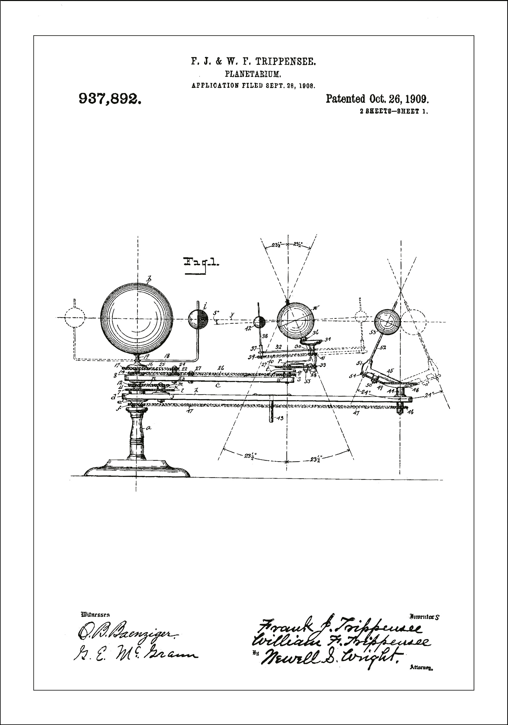 Dieses elegante Patentposter ist eine Hommage an die Ingenieurskunst und das Studium der Himmelskörper, mit einer detaillierten Darstellung des Planetariums von F. J. & W. F. Trippensee, einer klassischen Erfindung aus dem frühen 20. Jahrhundert. Das Patent, Nummer 937.892, wurde am 26. Oktober 1909 registriert, und der Antrag wurde am 28. September 1908 eingereicht. Dieses künstlerisch dargestellte Patentdokument ist ein einzigartiges Einrichtungselement, das sowohl eine Geschichtsstunde als auch einen Gesprächsöffner bietet. Es ist ideal für den Wissenschaftsbegeisterten oder um dem Zuhause, Büro oder Klassenzimmer eine akademische Atmosphäre zu verleihen.