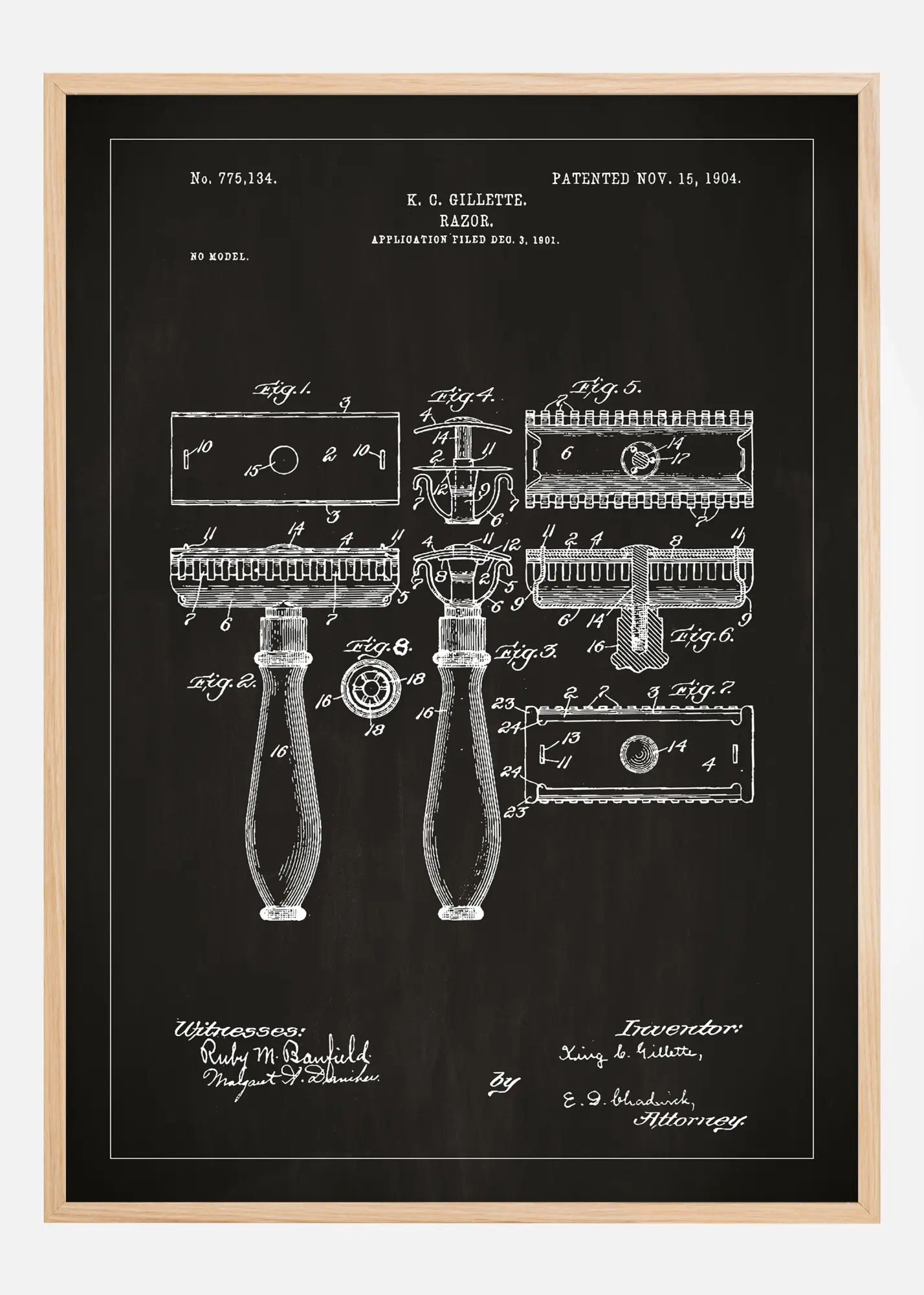 Dieses Patentplakat bietet einen exklusiven Einblick in das Design hinter einem der grundlegendsten Werkzeuge der persönlichen Pflege, nämlich dem Rasierapparat. Das Patent, das K.G. Gillette am 15. November 1904 unter der Nummer 775.134 erteilt wurde, veranschaulicht eine revolutionäre Veränderung in der Art und Weise, wie Menschen ihre tägliche Rasurroutine durchführten. Es ist eine detaillierte Patentskizze, die verschiedene Perspektiven und Komponenten zeigt, die zu jener Zeit innovativ waren.