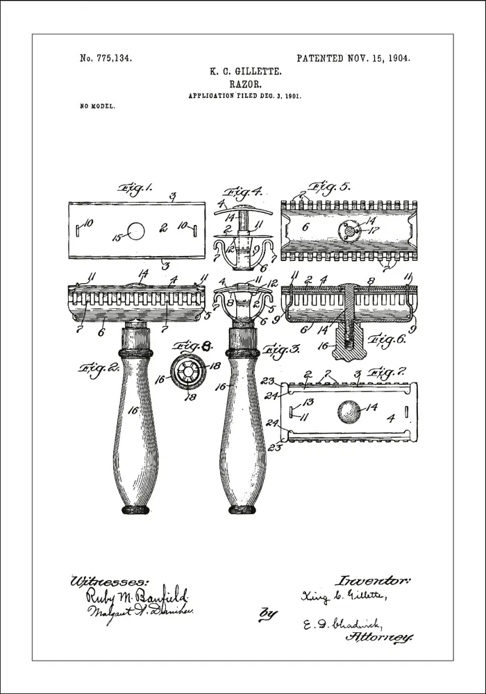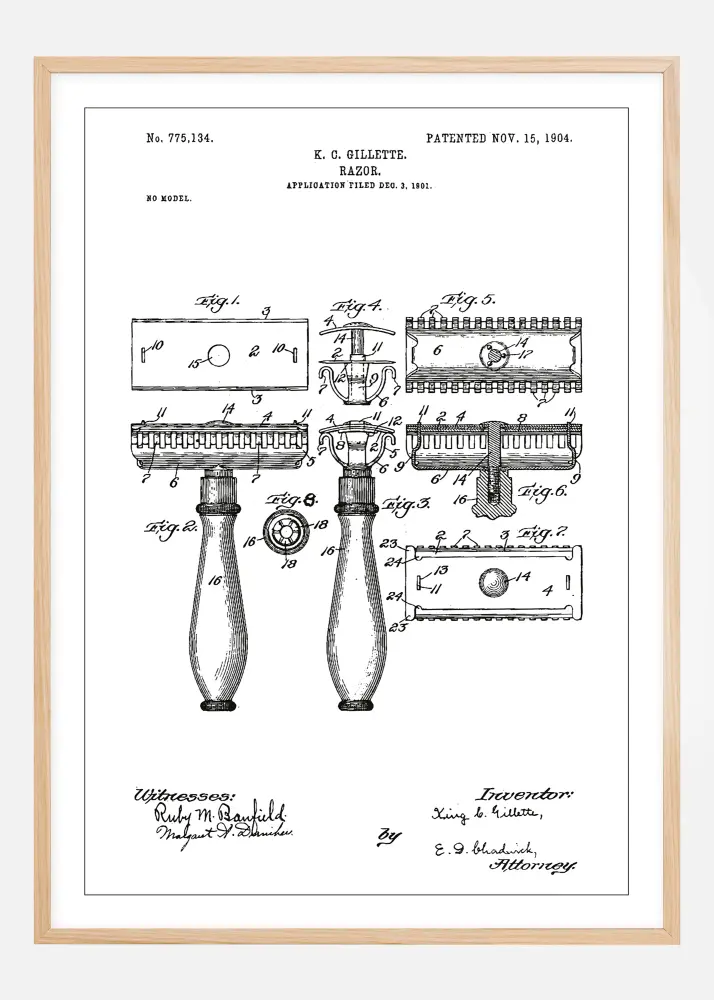 Mit einem ikonischen und stilvollen Design präsentiert dieses Patentreplik K.G. Gillettes revolutionäre Erfindung: den Rasierhobel, patentiert am 15. November 1904, Patentnummer 775,134. Die Details dieser Patentzeichnung heben die mechanischen Aspekte und die bahnbrechende Konstruktion hervor, die die persönliche Hygiene für immer veränderte, und dies wurde erstmals im Dezember 1901 dokumentiert.