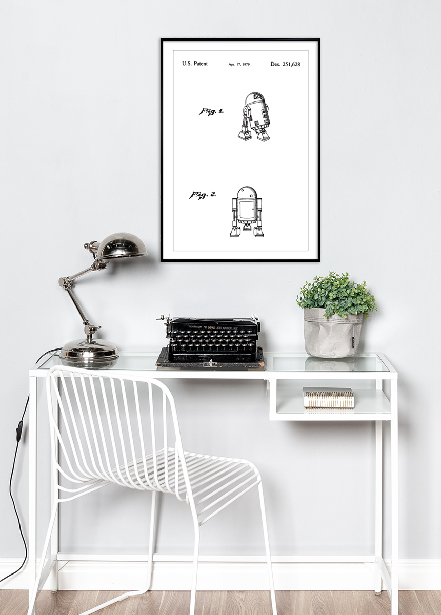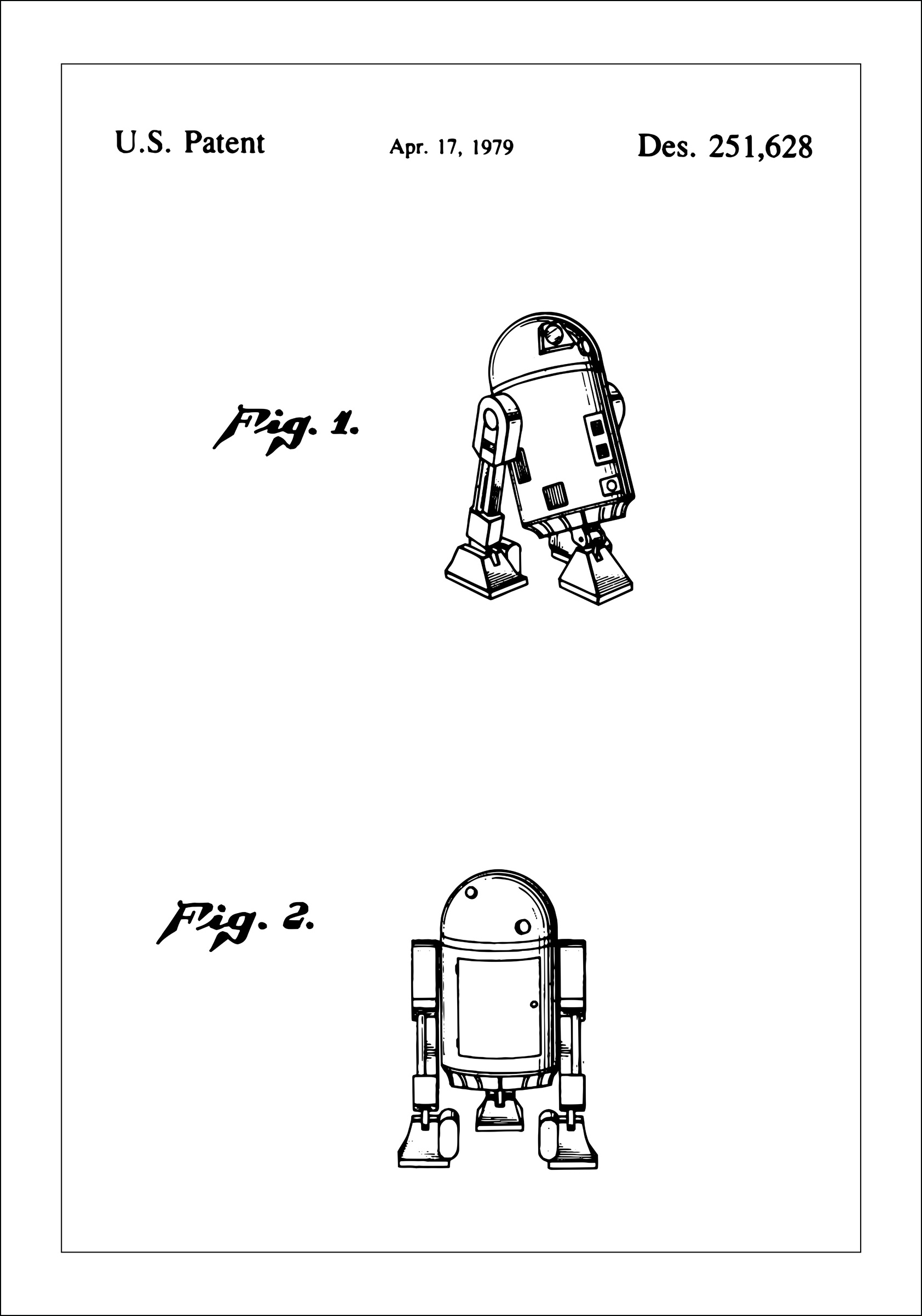 Dieses faszinierende Patentposter fängt die Essenz der Retrofuturismus mit einem Design für einen R2D2 aus StarWars ein, das den visionären Blick der Epoche auf die Technologie der Zukunft widerspiegelt. Mit einem amerikanischen Patent, datiert auf den 17. April 1979, unter der Registrierungsnummer Des. 251,628, illustriert dieses Motiv zwei Perspektiven einer ikonischen Roboterfigur, eine vollständige Profilansicht und eine Frontalansicht. Es ist eine zeitlose Patentzeichnung, die sowohl eine Hommage an als auch eine Dokumentation der Fortschritte in der Robotik des späten 20. Jahrhunderts und deren Einfluss auf die Populärkultur ist.
