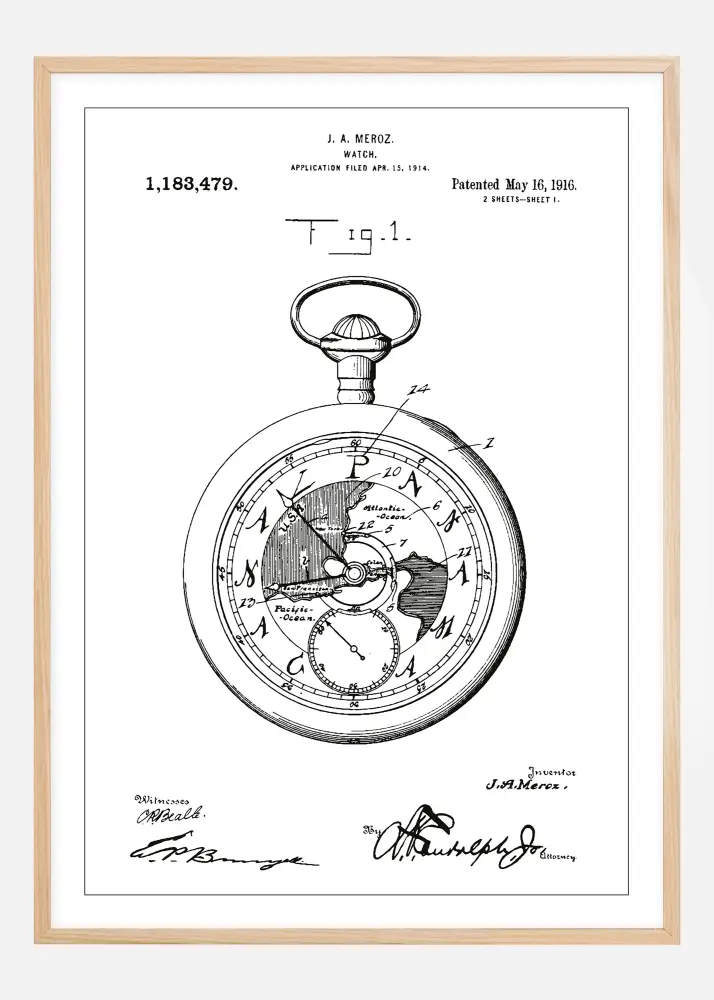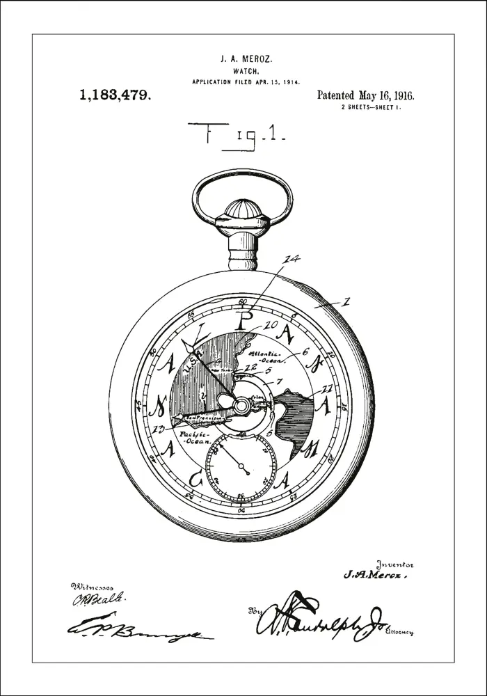 Dies ist ein faszinierender Patentposter, der eine detailreiche Skizze von J.A. Meroz' Uhrdesign zeigt, das am 16. Mai 1916 unter der Nummer 1,183,479 patentiert wurde. Die Patentzeichnung zeigt eine klassische Taschenuhrsilhouette mit den markanten Elementen der inneren Mechanik des Zeitmessers und unterstreicht eine Ära technischer Innovation und Handwerkskunst in der Uhrmacherkunst.