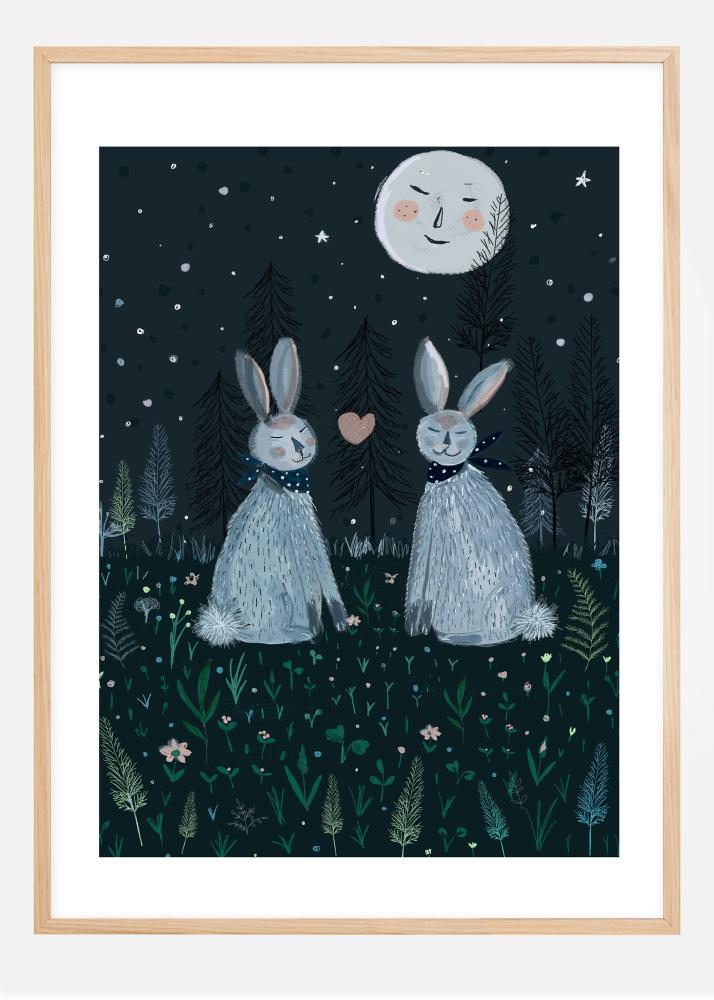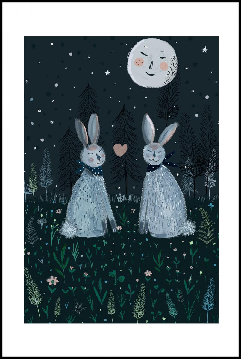 Ein lustiges Porträt mit dem Mond und den schlafenden Waldkaninchen. Die Sterne leuchten hell, während die Bodenpflanzen kühl in der Abendstimmung stehen. Mit den Kopftüchern, die um die Hälse der Kaninchen gebunden sind, und einem Herz zwischen ihnen ist dies ein perfektes Bild für jeden Verliebten.