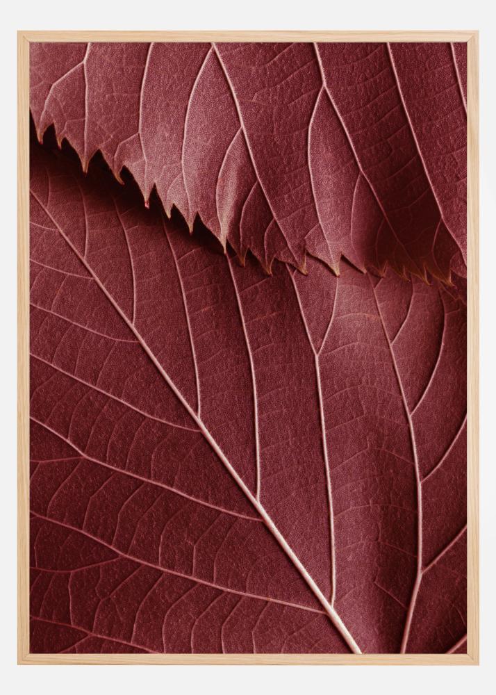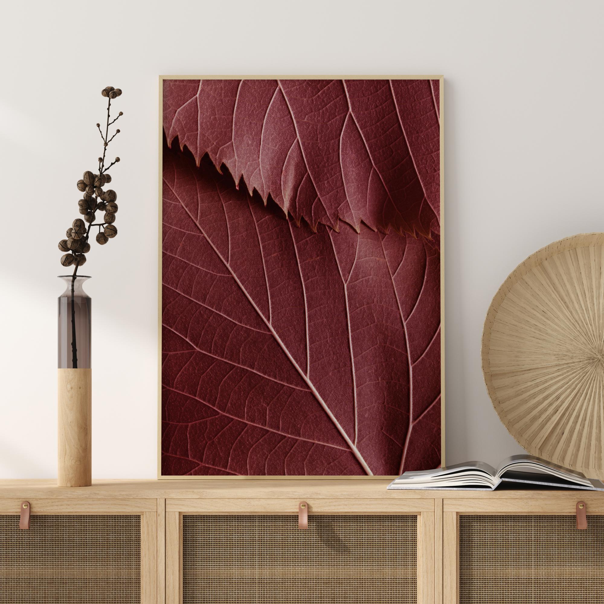 Botanische Fotokunst von dunkelroten Blättern mit lebendigen Mustern. Ein stilvolles poster in warmen Nuancen in einem Stil, der es perfekt macht, es mit anderen herrlichen Motiven an einer größeren Bildwand zu kombinieren.