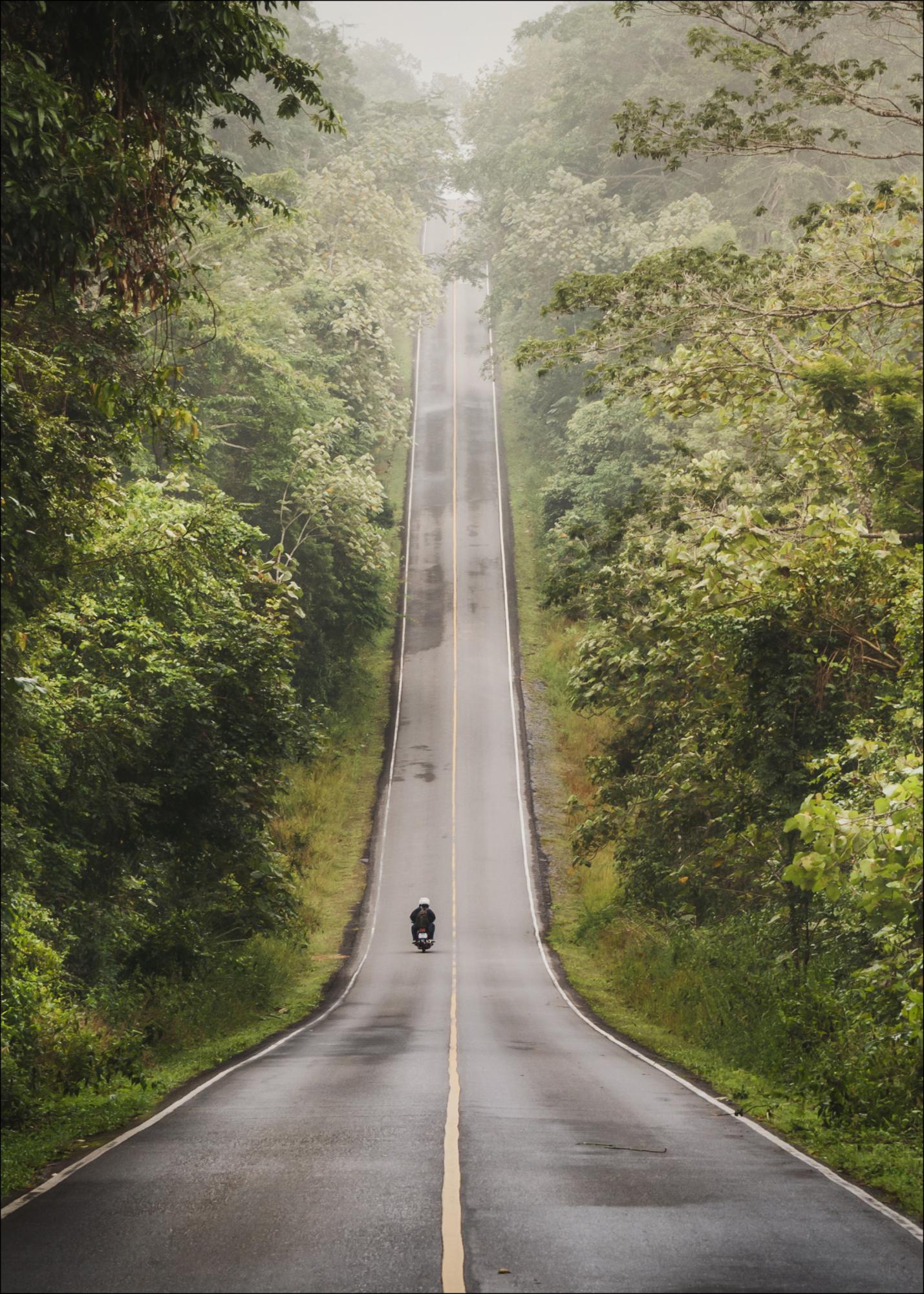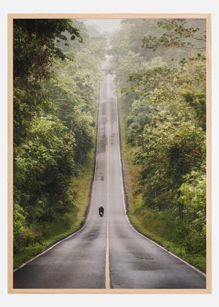 Ein ruhiges Naturfoto einer Straße mit einem einsamen Motorradfahrer, der durch herrlich üppiges Grün fährt. Ein ruhiges und beruhigendes Poster, das sich hervorragend mit anderen Favoriten an einer größeren Bildwand kombinieren lässt.