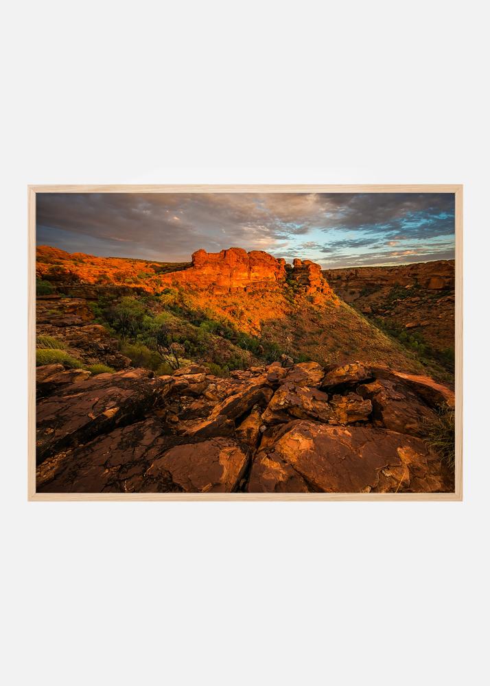 Poster mit einem Fotografie von kargen roten Bergen bei Sonnenuntergang, etwas für denjenigen, der Wüsten und Felsformationen mag, um an die Wand zu hängen. Die warmen roten Töne gegen den eisblauen Himmel und die Tiefe im Bild schaffen ein interessantes Motiv. Rahmen Sie das poster mit einem stilvollen Fotorahmen ein und platzieren Sie es an einer Bildwand zusammen mit anderen Wüstenmotiven.