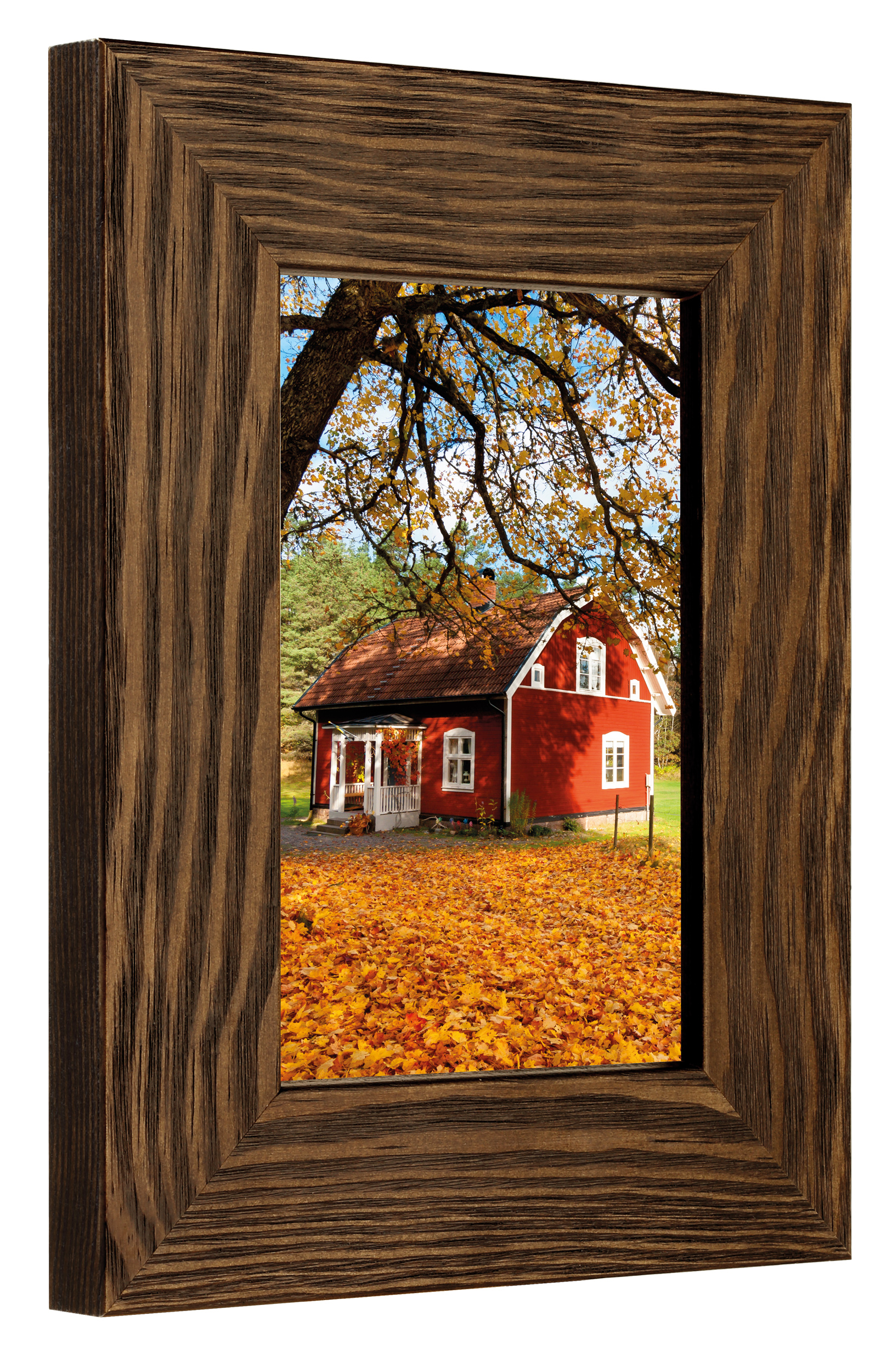 Gediegener brauner Holzrahmen mit sichtbarer Holzmaserung und einem breiten Profil. Perfekt, wenn du einen dunklen Holzrahmen suchst, der ein natürliches Gefühl verleiht. Gut geeignet für Ambientefotos und Landschaftsbilder.