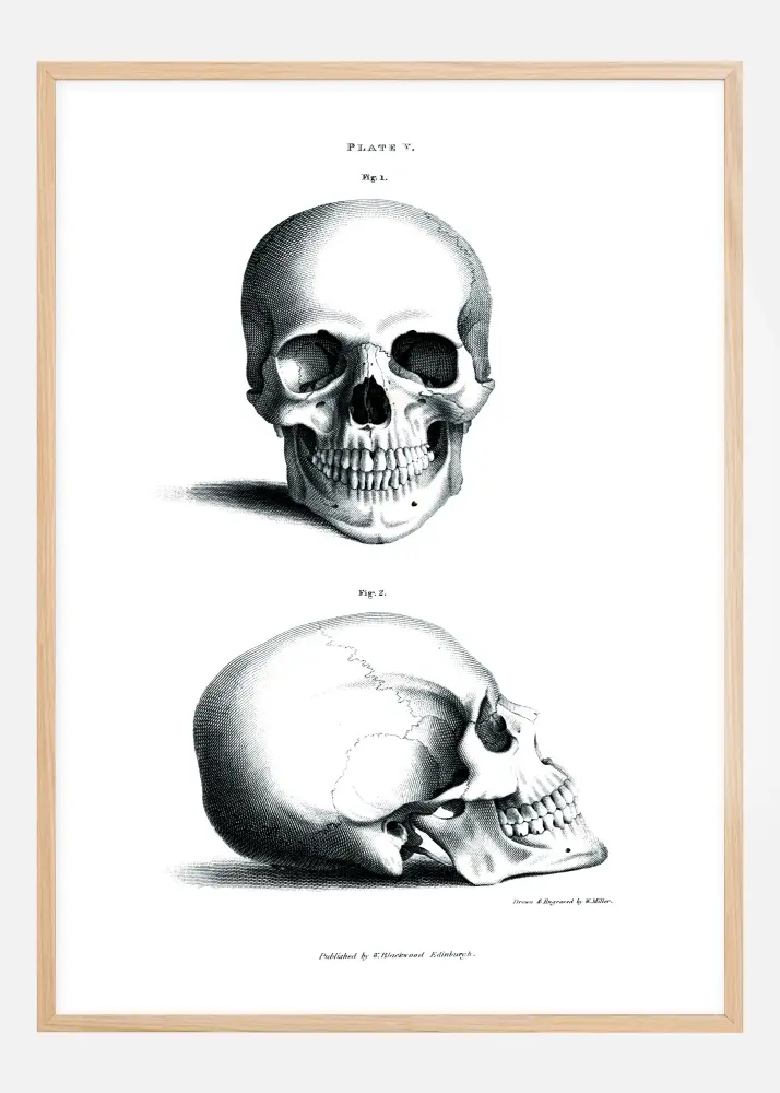 Haben Sie keine Angst davor, plakat mit etwas makabren Motiven aufzuhängen, wenn Sie dekorieren - alles hängt davon ab, womit Sie sie kombinieren! Dieses schicke plakat stammt aus einem alten Lehrbuch, das im 19. Jahrhundert veröffentlicht wurde. Der Illustrator hieß William Miller und er war ein erfolgreicher Graveur. Das Motiv zeigt einen menschlichen Schädel von vorne und von der Seite, mit sehr gut ausgearbeiteten Details. Unter dem Motiv finden Sie den Namen des Graveurs sowie Informationen über den Verleger. Da das plakat schwarz-weiß ist, funktioniert es genauso gut mit einem schwarzen Rahmen wie mit einem farbenfroheren. Es ist in mehreren verschiedenen Größen erhältlich, so dass Sie leicht eine finden können, die in Ihr Zuhause passt.