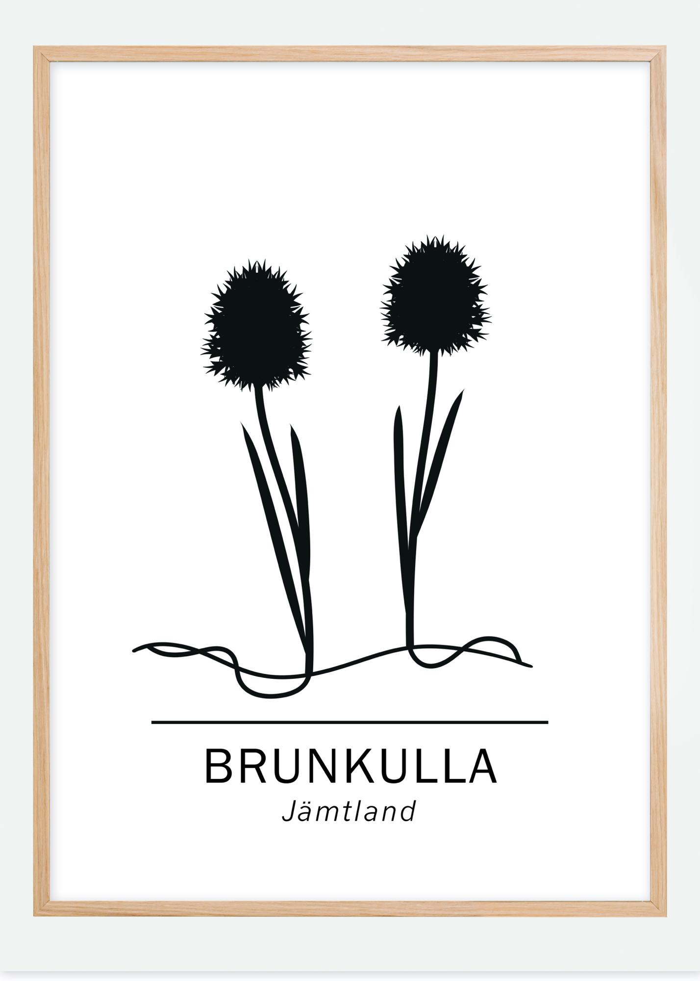 Ein einfaches Poster von zwei seltenen schwarzen Brunkulla-Orchideen auf weißem Hintergrund. Der Schriftzug Brunkulla Jamtland steht in diesem minimalistischen Bild unter den einfachen Orchideen im Druckstil. Kombinieren Sie es mit einer leuchtenden Farbe Ihrer Wahl, um die kräftigen Disteln noch mehr aus dem Bild herauszuheben.