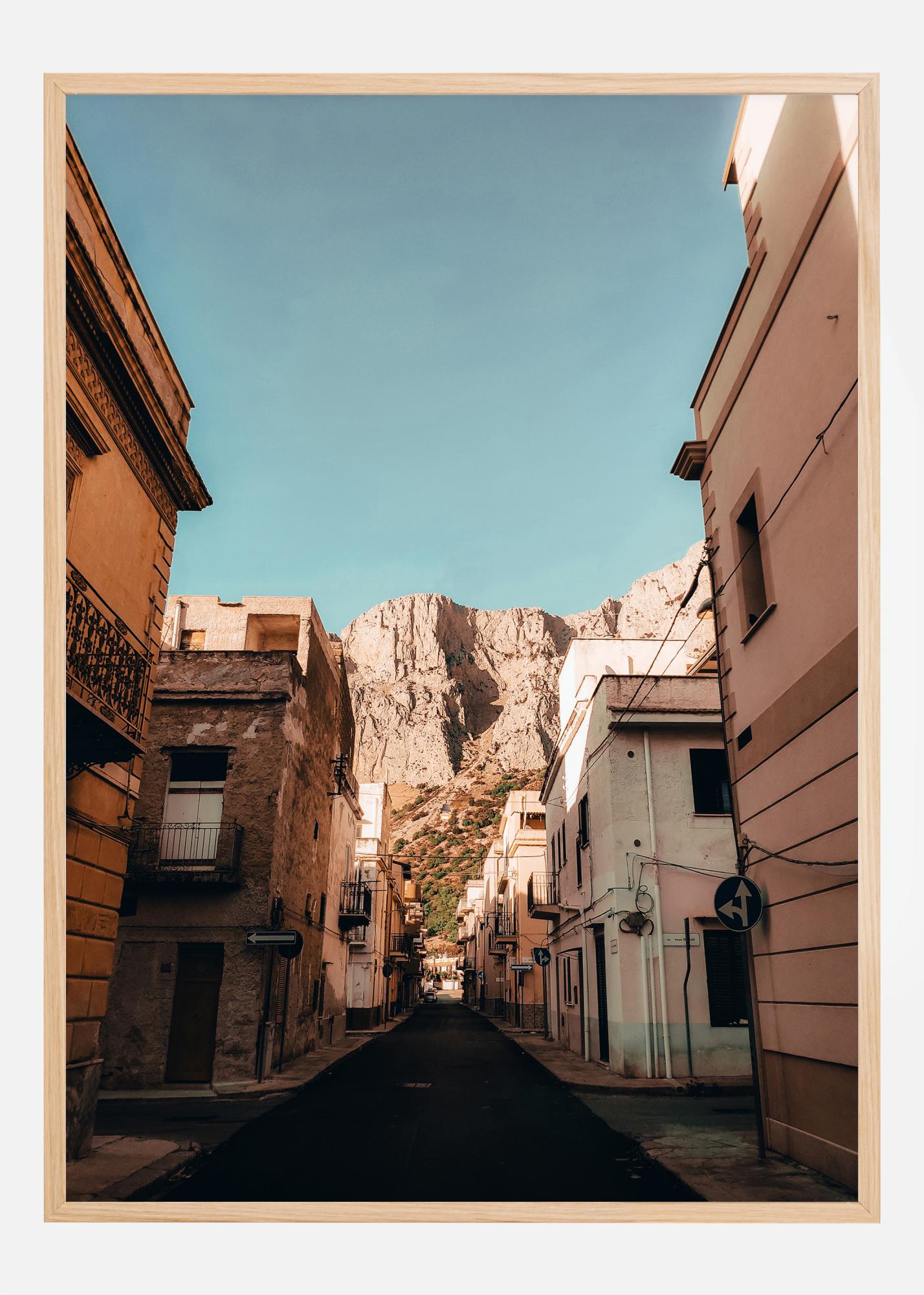 Dieses bezaubernde Poster fängt das Wesen einer malerischen Straße im sizilianischen Dorf Cinisi ein, mit seinen warmen Erdtönen und einem Hintergrund des beeindruckenden Berges, der sich gegen einen klarblauen Himmel erhebt. Die blassrosa und gelben Töne der Gebäude stehen in schönem Kontrast zur rauen Berglandschaft im Hintergrund und vermitteln ein Gefühl von Ruhe und Stille. Dieser Druck ist eine Hommage an den rustikalen Charme Siziliens und seine Fähigkeit, Natur und Kultur in einem harmonischen Ganzen zu vereinen.