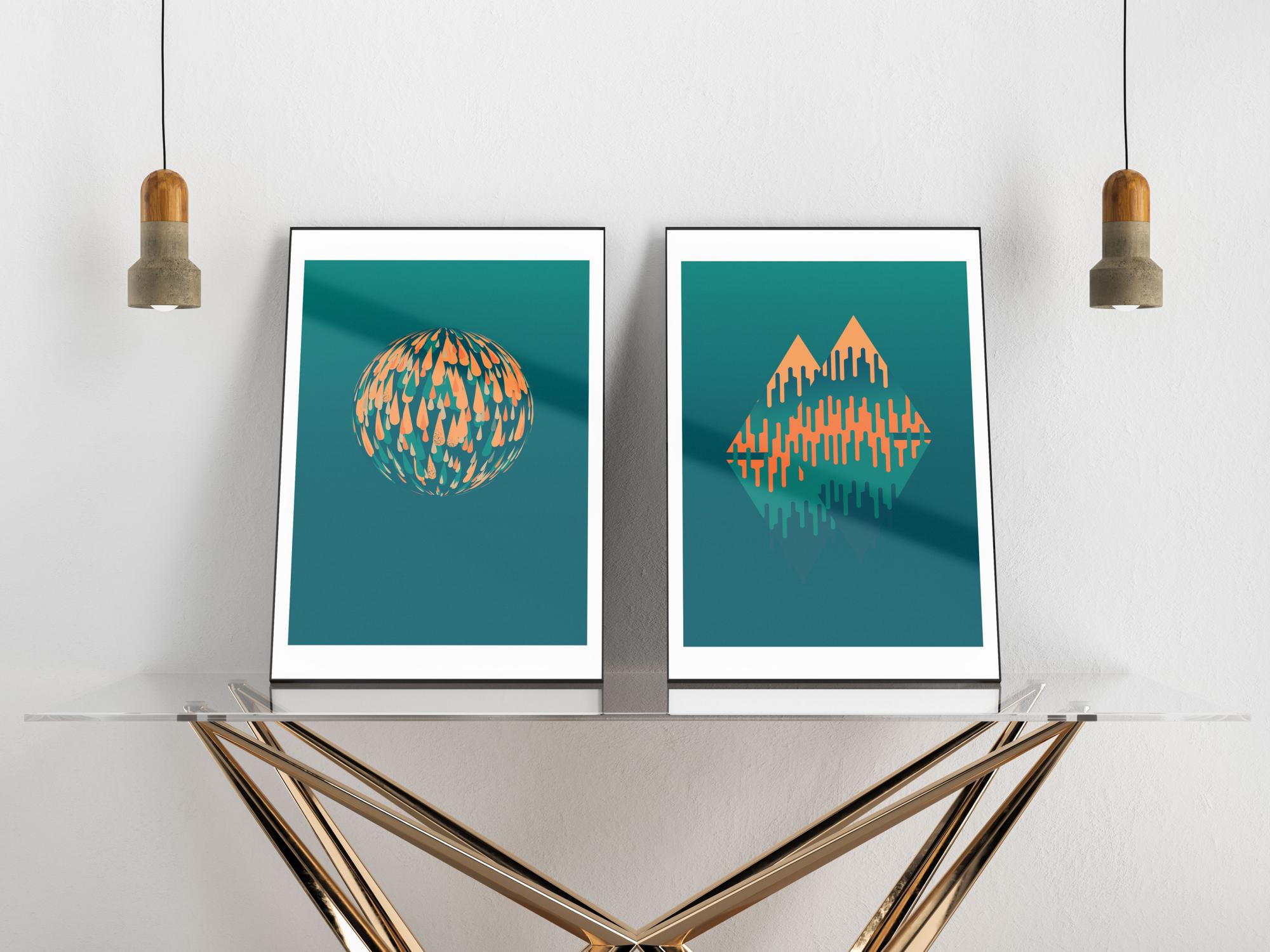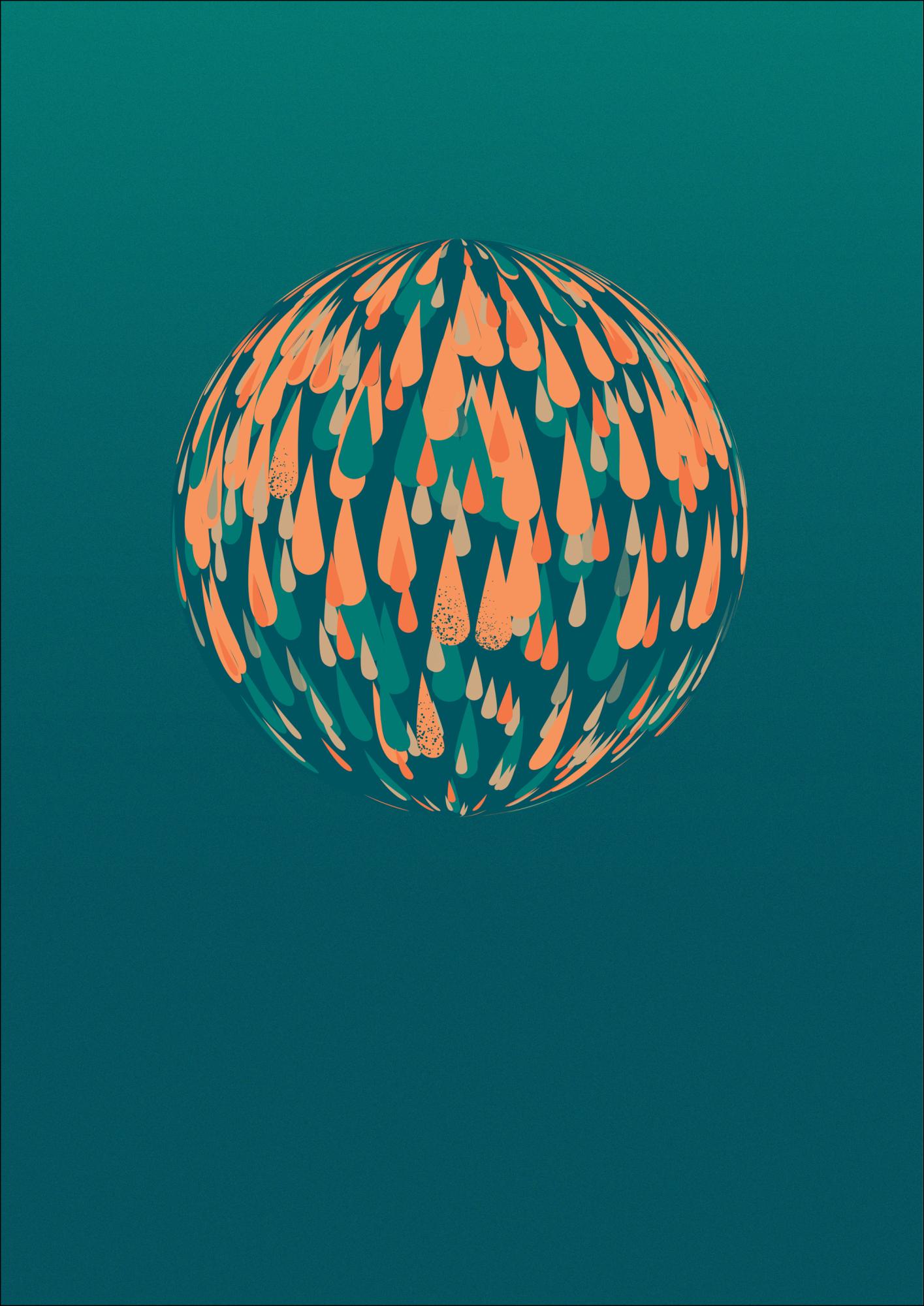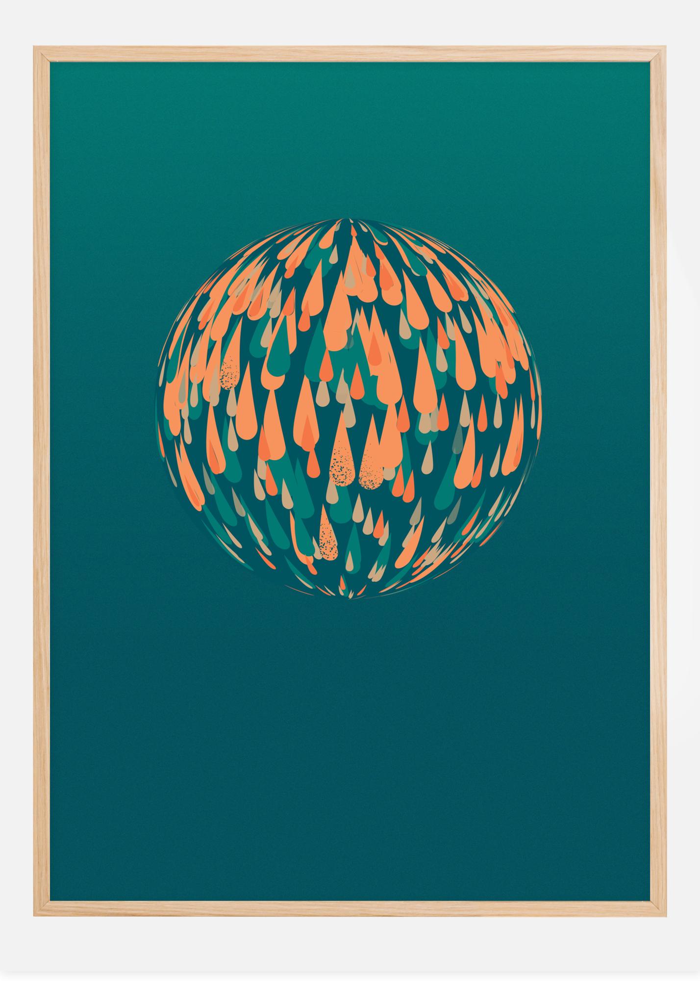 Ein helles Poster einer Kugel, die aus leuchtenden Farbtröpfchen besteht. Orangefarbene und blaue Tröpfchen bilden eine 3D-Kugel auf einem atemberaubenden blaugrünen Hintergrund. Dieses schlichte, aber elegante Bild ist faszinierend, wenn man sieht, wie sich all die Tröpfchen unter der Kugel wölben. Bringen Sie es an einer schlichten Wand an, damit die Farben nicht Überhand nehmen.