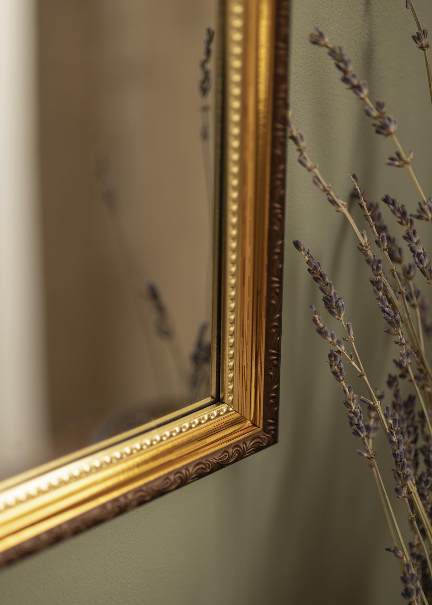 Der Spiegel Abisko Gold ist ein schöner Wandspiegel für alle, die sich einen dekorativen, eleganten Spiegel im Retro-Stil wünschen. Der Spiegel ist mit einem Rahmen in braunem Farbton ausgestattet. Am Spiegelausschnitt verstärkt die goldene Farbnuance das Retro-Design und den ansprechenden Ausdruck dieses hübschen Wohnspiegels. Die Rahmenleiste hat eine Breite von 25 mm und das stilvolle Ornament-Muster macht diesen Wandspiegel zu einem echten Blickfang, der sowohl in Wohnzimmer als auch in Schlafzimmer oder Eingangsbereich passt.
