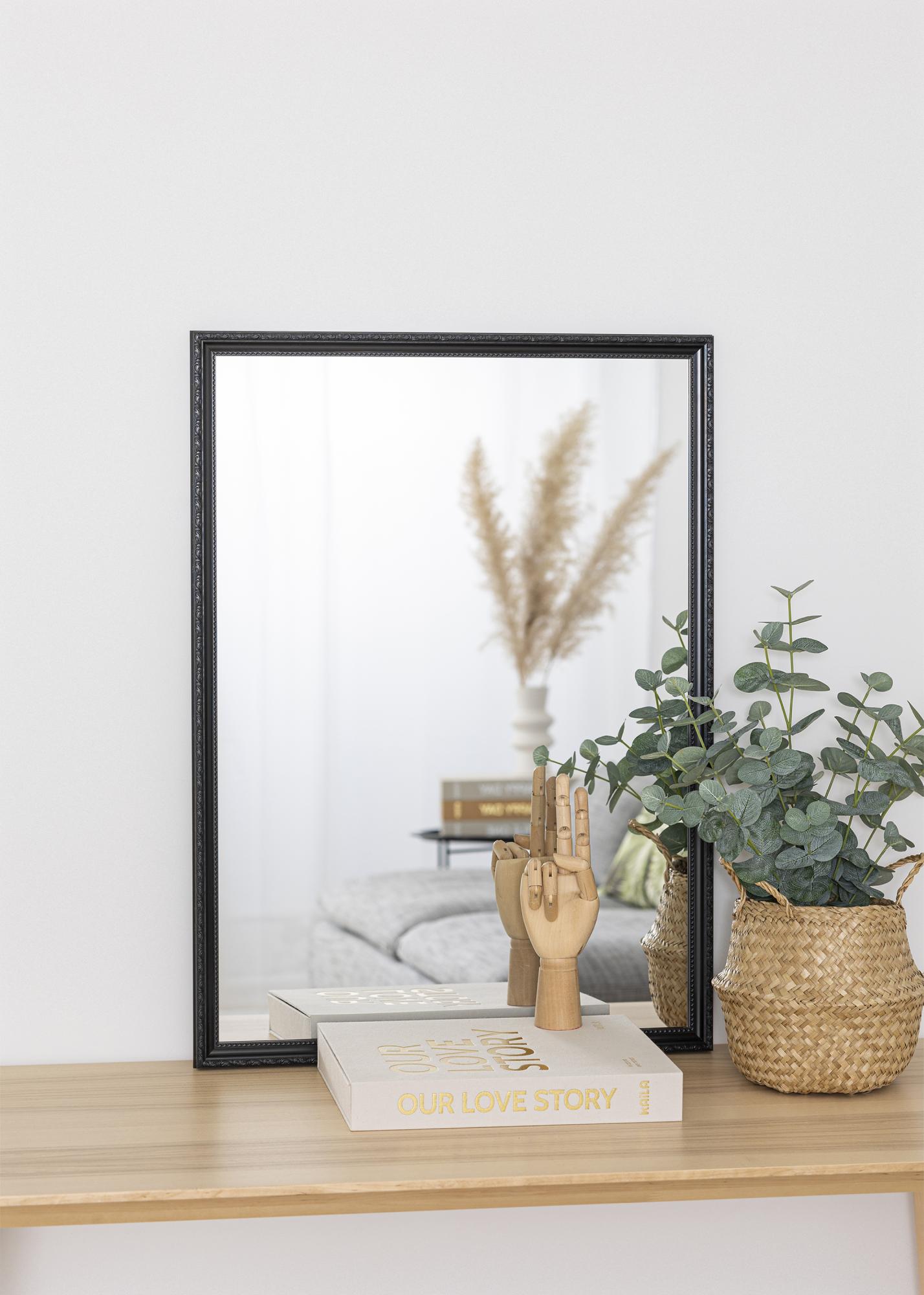 Dieser Wandspiegel zeichnet sich durch seinen einerseits schlichten, unaufdringlichen Ausdruck und andererseits durch das filigrane Ornament-Muster des Rahmens aus, das diesen Wohnspiegel zu einem dekorativen Wohnaccessoire macht. Der Rahmen ist aus einem Komposit-Kunststoff gefertigt und das kunstvoll gemusterte, reliefartige Profil verleiht diesem schönen Wohnspiegel sein charakteristisches, stilvoll-elegantes Aussehen. Trotz des schönen Rahmens ist es doch der Spiegel, der im Fokus bleibt. Damit ist dieser Spiegel mit Rahmen ein wirklich funktioneller und zugleich hübscher Blickfang, der Wohnzimmer, Schlafzimmer oder auch Flur und Eingangsbereich verschönern kann. Der Spiegel kann sowohl im Hochformat als auch im Querformat an der Wand aufgehängt werden.