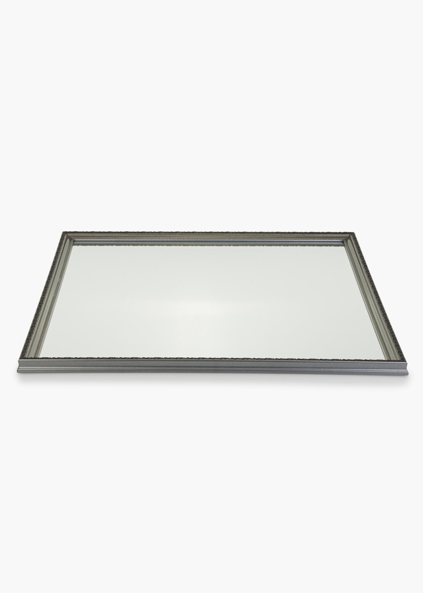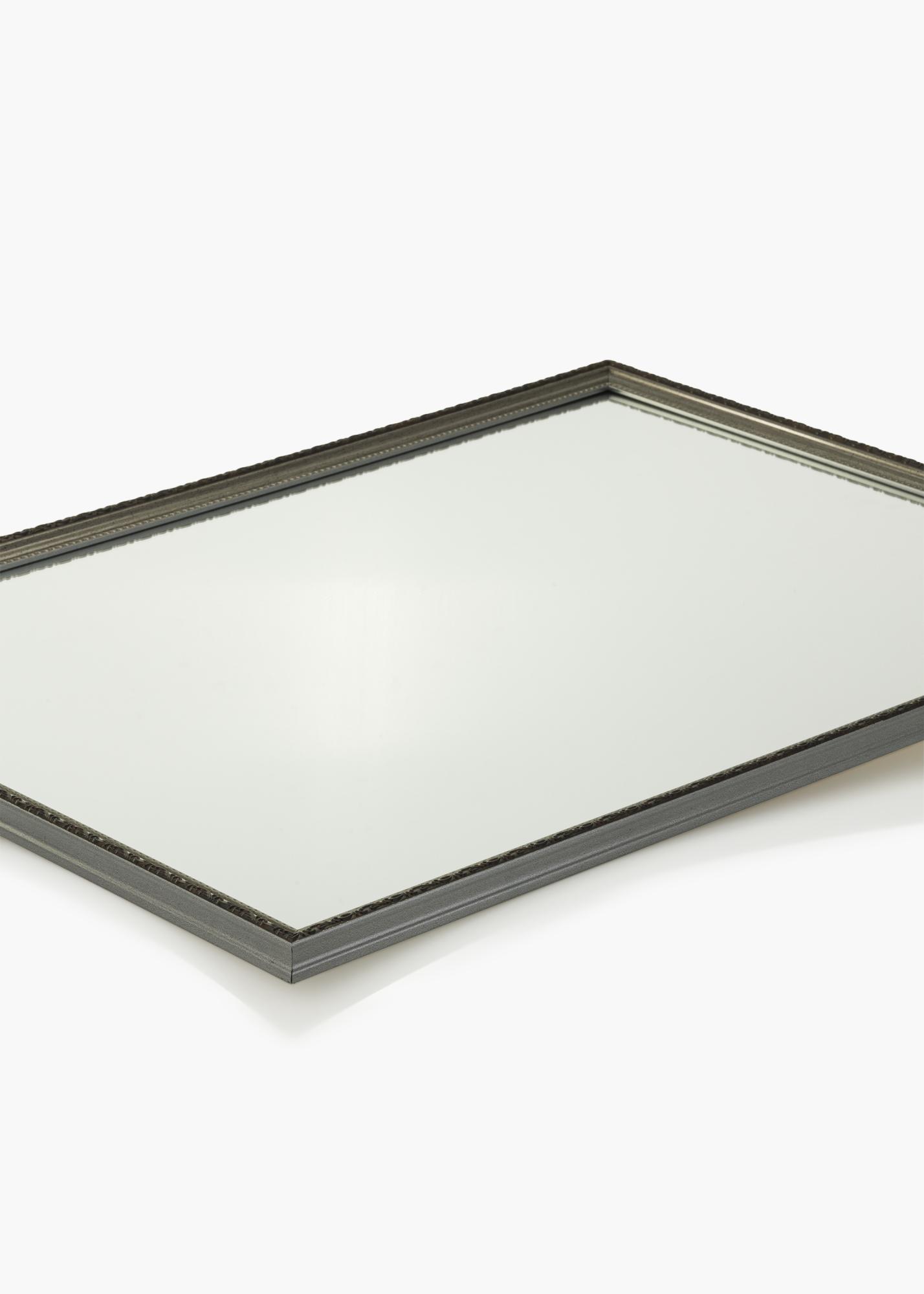 Dieser Wandspiegel überzeugt durch seinen schönen Rahmen in stilvollem, silbernem Farbton, der durch eine schwarze Kante dezent betont wird. Die elegante Farbgebung dieses Wandspiegels ergänzt sich wunderbar mit dem Ornament-Muster des Rahmenprofils, wodurch ein sehr ansprechender, stilsicherer Gesamteindruck entsteht. Die Rahmenleiste hat eine Breite von 25 mm. Der Rahmen ist aus Komposit, einem Kunststoffverbundmaterial, gefertigt.
