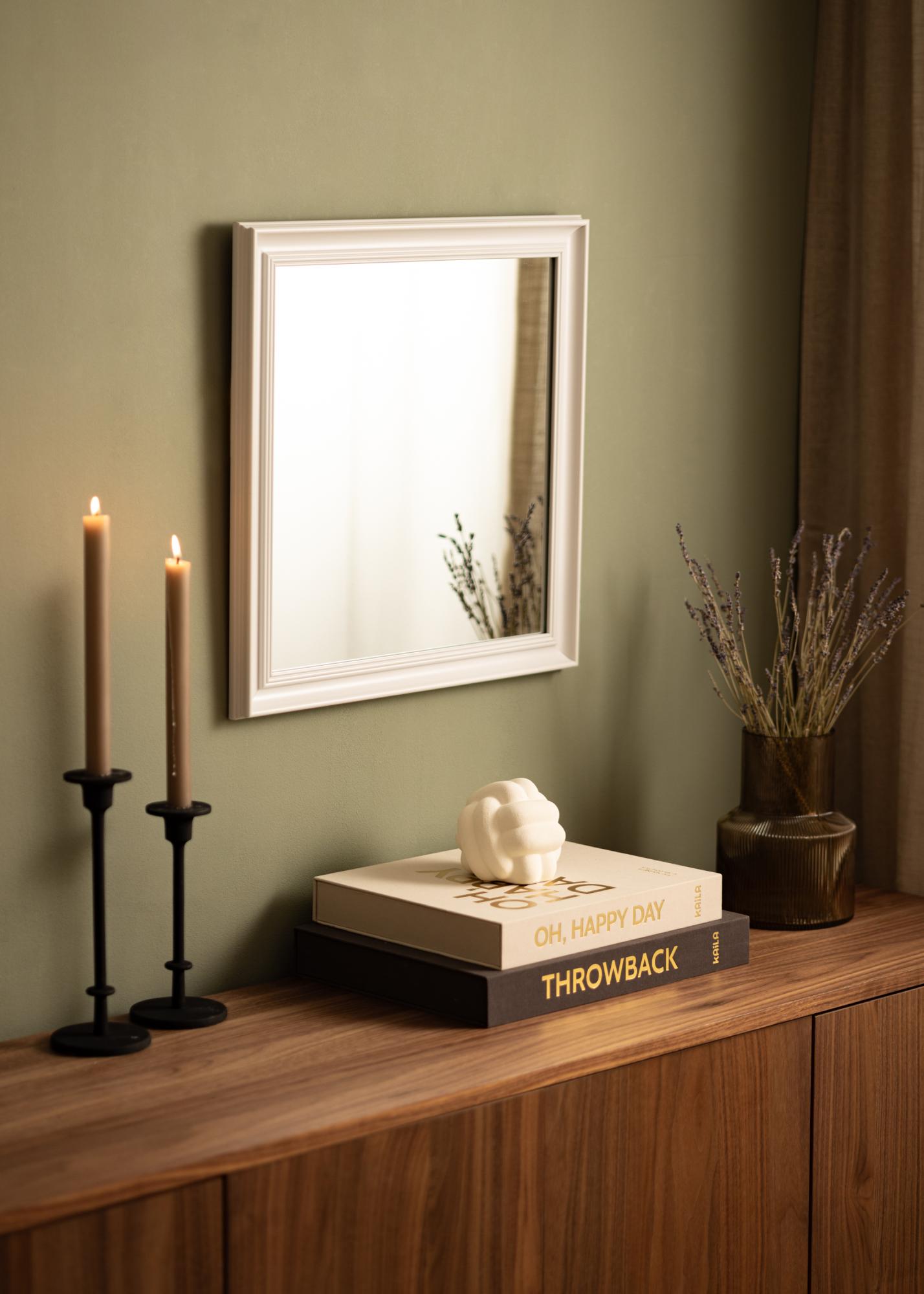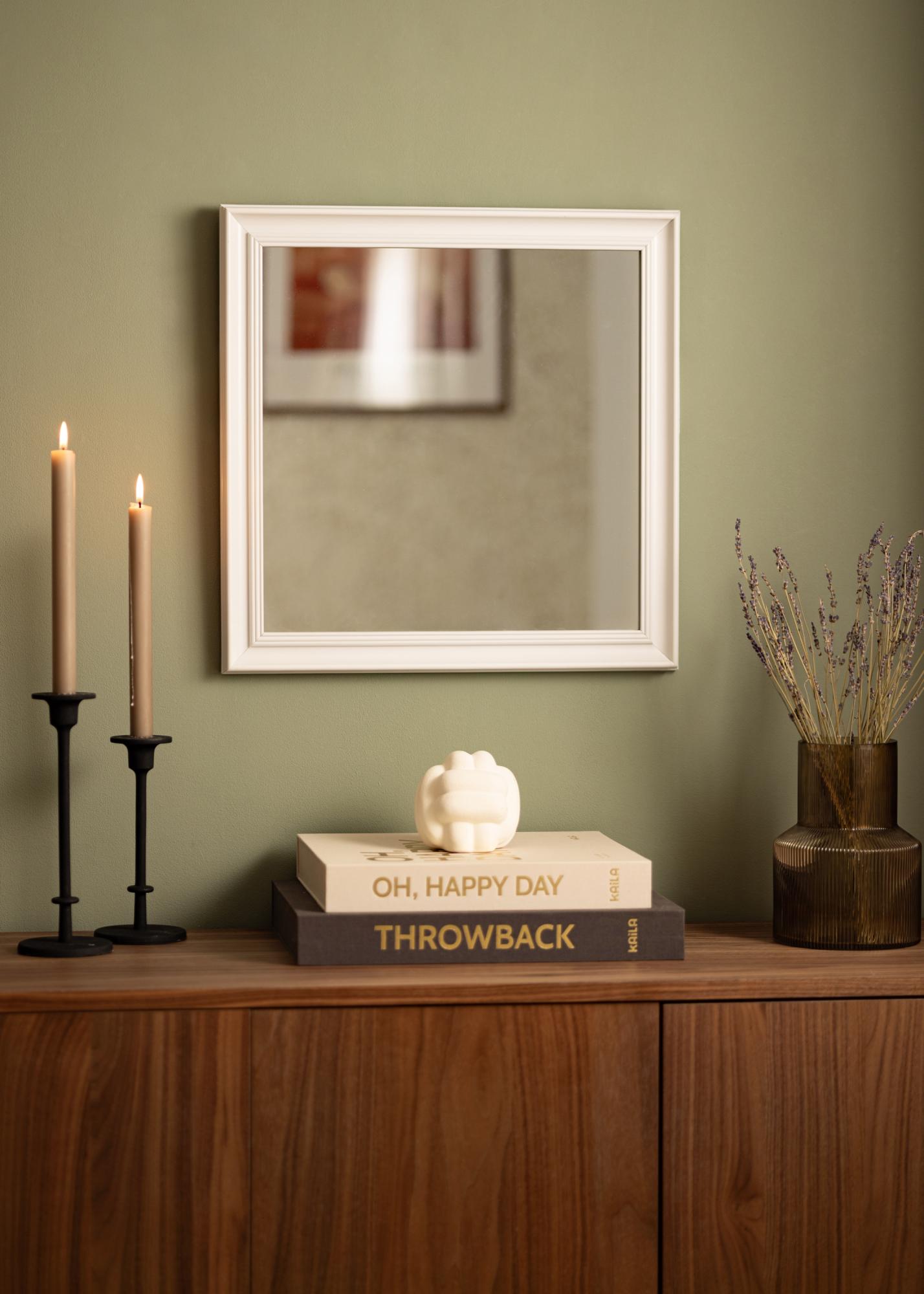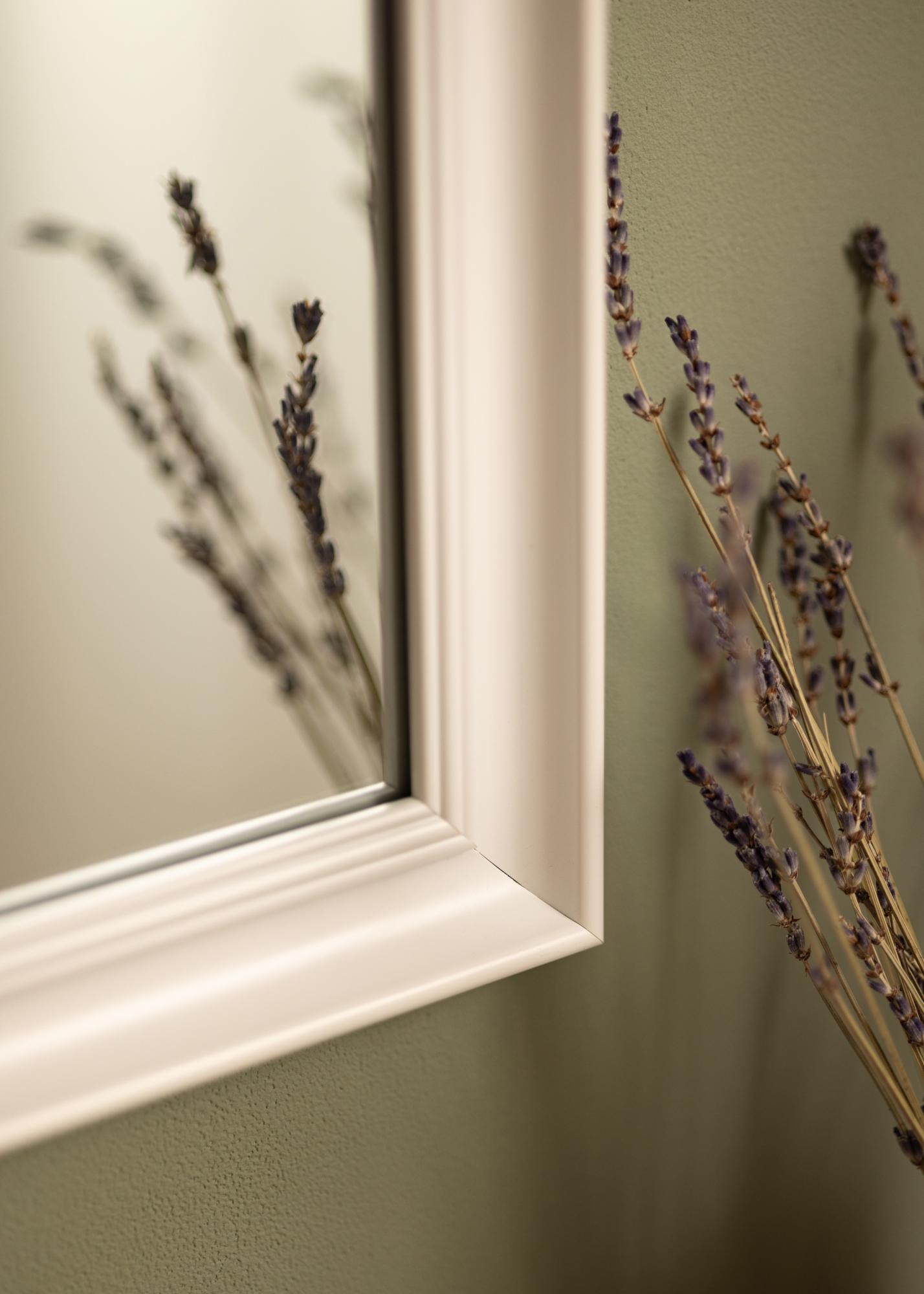 Alice Weiß ist ein Spiegel, dessen Rahmen in einem klassischen präzisen Stil gehalten ist und der mit seinen geraden Linien den Fokus ganz auf das Motiv legt.