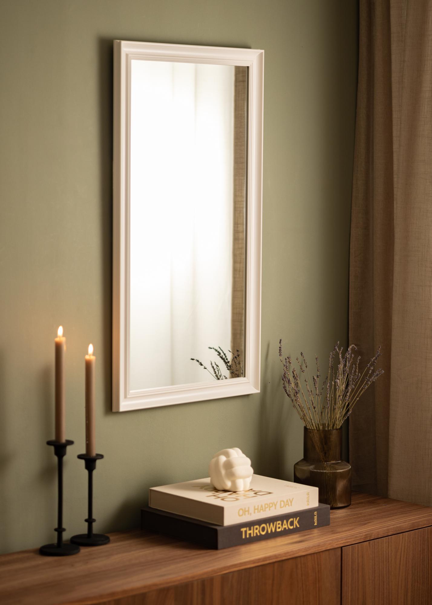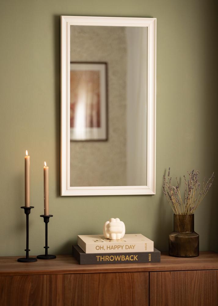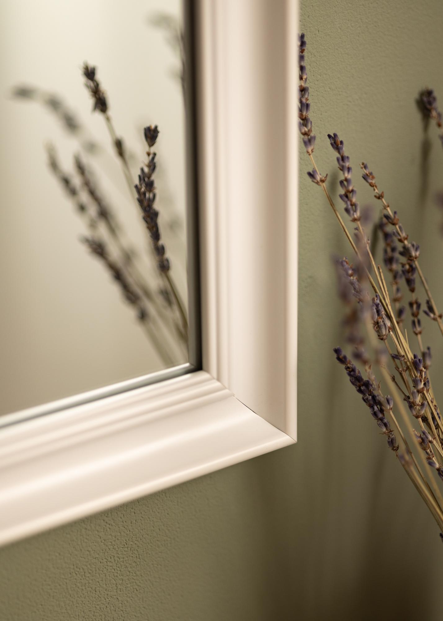 Alice Weiß ist ein Spiegel, dessen Rahmen in einem klassischen präzisen Stil gehalten ist und der mit seinen geraden Linien den Fokus ganz auf das Motiv legt.